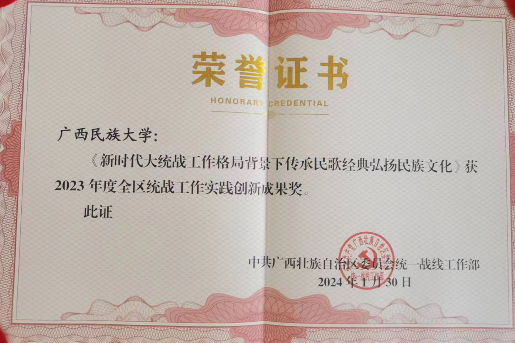 廣西民族大學《新時代大統戰工作格局背景下傳承民歌經典弘揚民族文化》項目獲2023年度全區統戰工作實踐創新成果獎