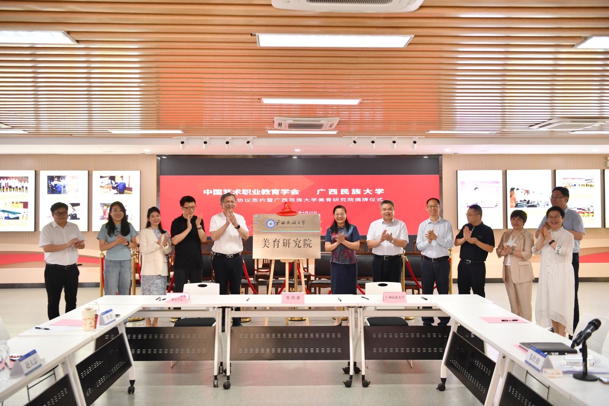 【大學生通訊社報道】4月25日上午,廣西民族大學美育研究院揭牌儀式在新時代“我與祖國共成長”黨團主題活動文明實踐所舉行。廣西民族大學校長韋仕珍,中國藝術職業教育學會會長王豐簽訂合作框架協議,共同為廣西民族大學美育研究院揭牌。校黨委副書記陳銘彬主持活動。