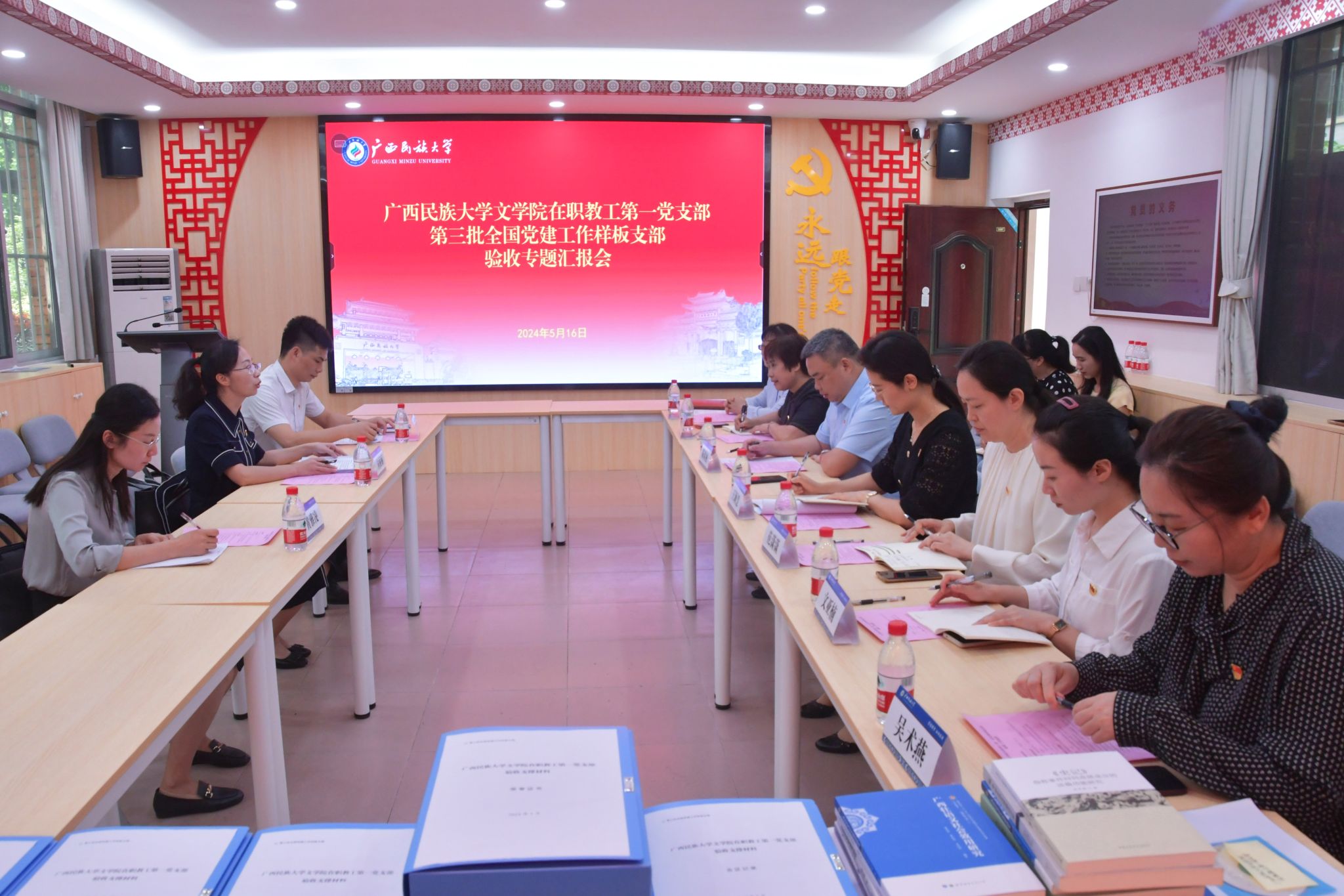 【學校召開全國黨建工作樣板支部驗收專題匯報會】5月16日,第三批全國黨建工作樣板支部文學院在職教工第一黨支部驗收專題匯報會召開,校黨委副書記陳銘彬,驗收組組長、廣西藝術學院建筑藝術學院黨委書記向麗麗出席會議。驗收組對我校樣板支部培育創(chuàng)建工作給予肯定,就完善支部機制體制、深化支部品牌內(nèi)涵建設等提出建議。(初審/范瀟瀟 復審/潘之銘 終審/王文娟)