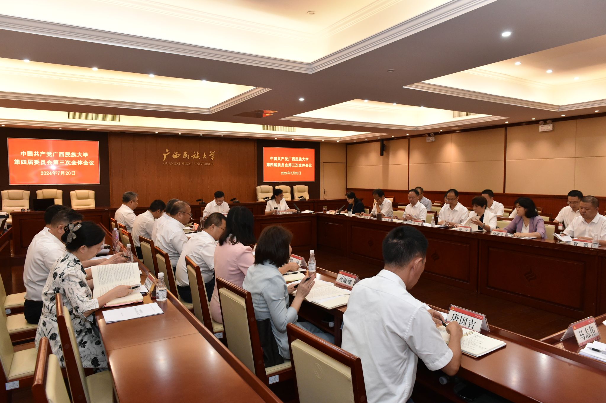 7月20日下午,中國共產黨廣西民族大學第四屆委員會第三次全體會議在辦公樓212會議室召開。會議審議通過學校黨委書記卞成林代表學校黨委常委會作的2024年上半年工作報告,審議通過學校紀委2024年上半年工作報告(書面)。學校黨委副書記、校長韋仕珍主持會議。