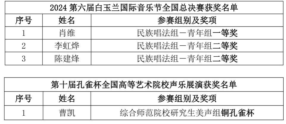 近日,2024第六屆白玉蘭國際音樂節全國總決賽、第十屆孔雀杯全國高等藝術院校聲樂展演落幕,廣西民族大學藝術學院/民歌學院參賽學生在第六屆白玉蘭國際音樂節全國總決賽中斬獲一等獎1項、二等獎2項,在第十屆孔雀杯全國高等藝術院校聲樂展演榮獲“銅孔雀杯”1項。(初審:吳小軍 編輯:陳水蘭 復審:榮子卿 終審:王文娟)