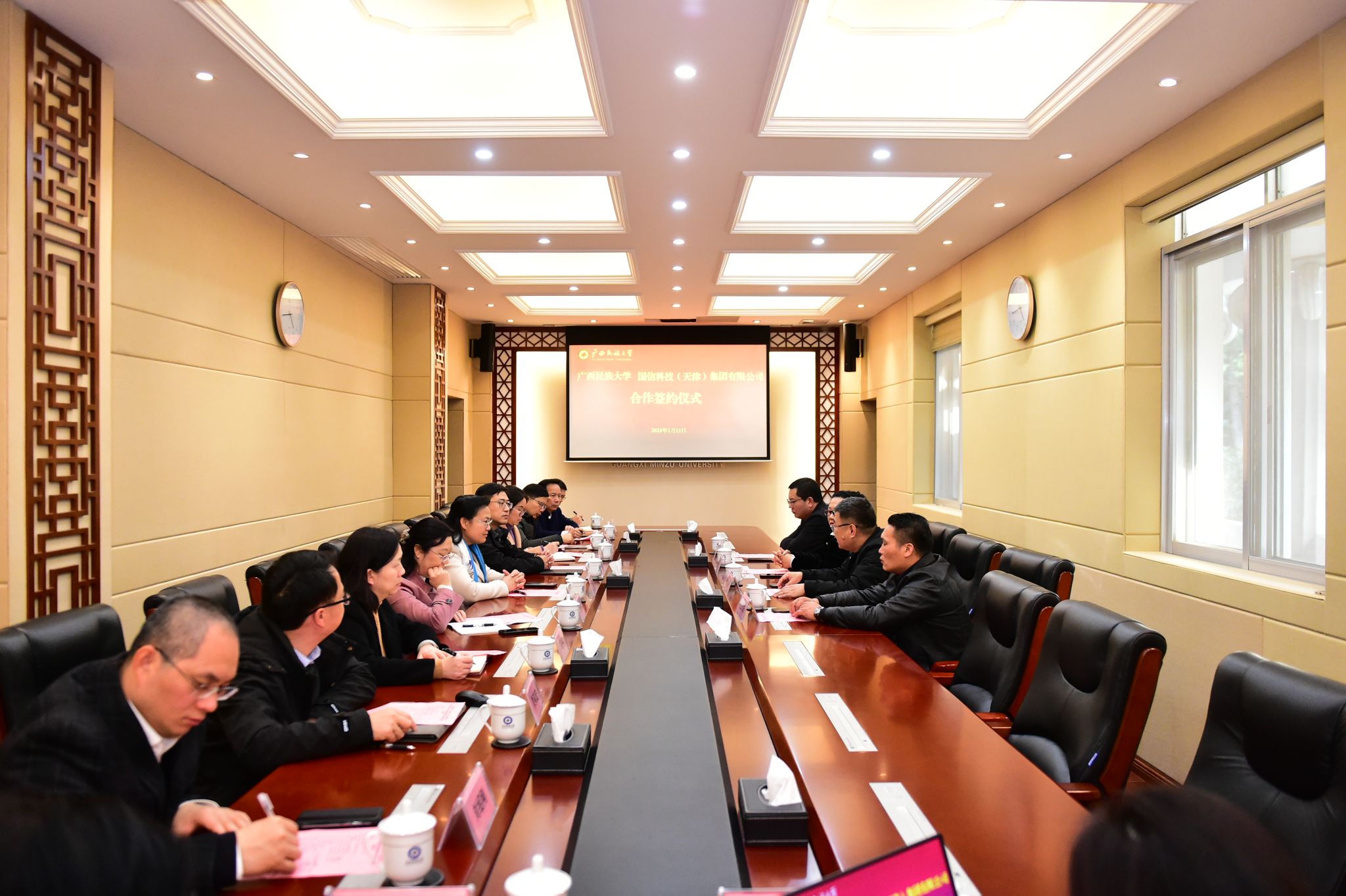 【大學生通訊社報道】1月11日下午,廣西民族大學與國信科技(天津)集團有限公司合作簽約儀式在辦公樓211會議室舉行。校長韋仕珍、國信科技(天津)集團有限公司國際現代農業及醫療健康事業部首席執行官唐曉春等出席簽約儀式,副校長高興宇主持儀式,學校科學技術處、發展規劃處及有關理工科學院負責人參會。