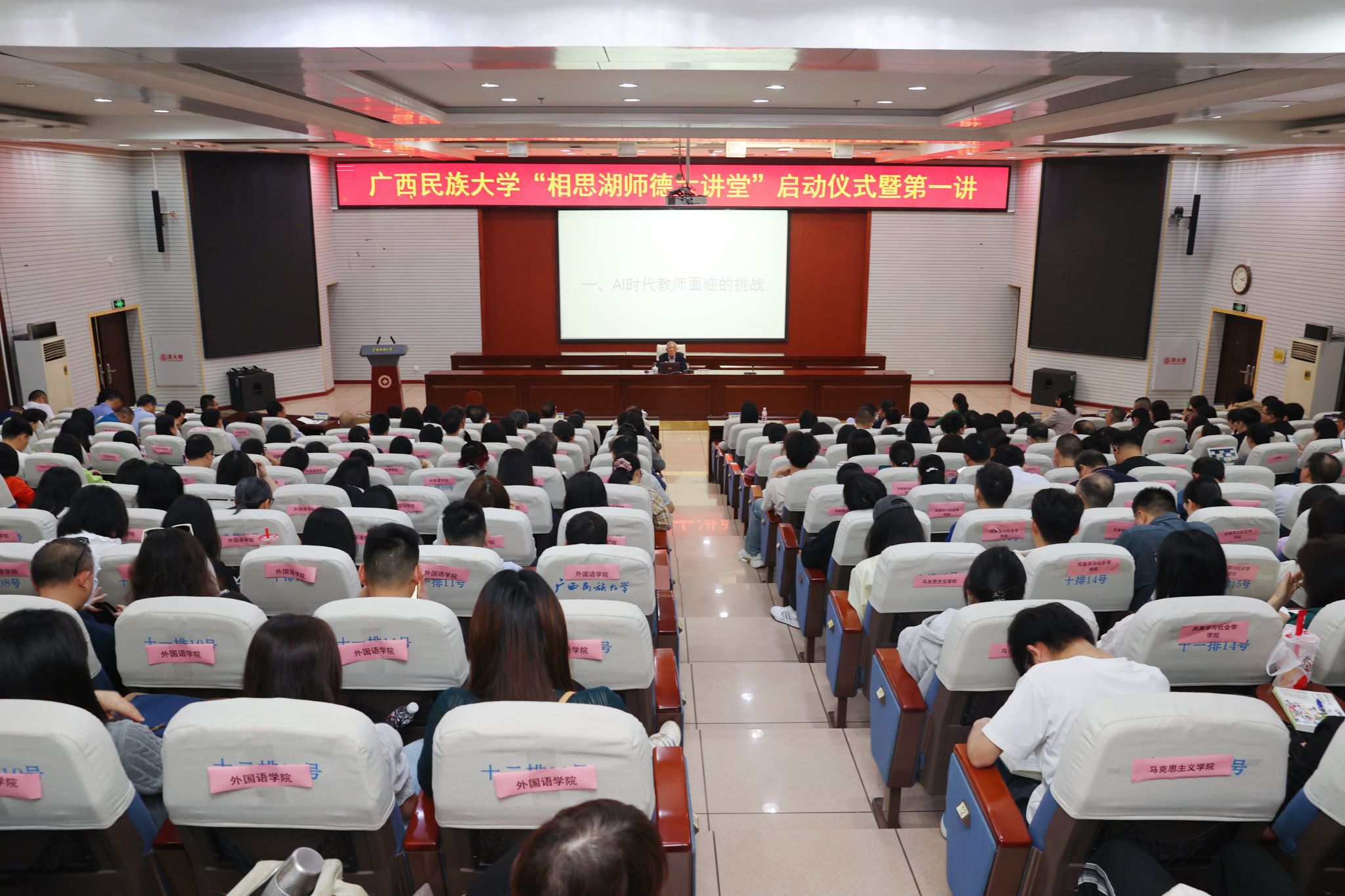 【大學(xué)生通訊社報道】3月25日下午,廣西民族大學(xué)“相思湖師德大講堂”啟動儀式暨第一講在科技樓報告廳舉行。校長韋仕珍出席啟動儀式并致辭,副校長蔡高根主持活動,華東師范大學(xué)首批終身教授陳玉琨作題為“AI時代高校師德師風(fēng)建設(shè)”的講座。