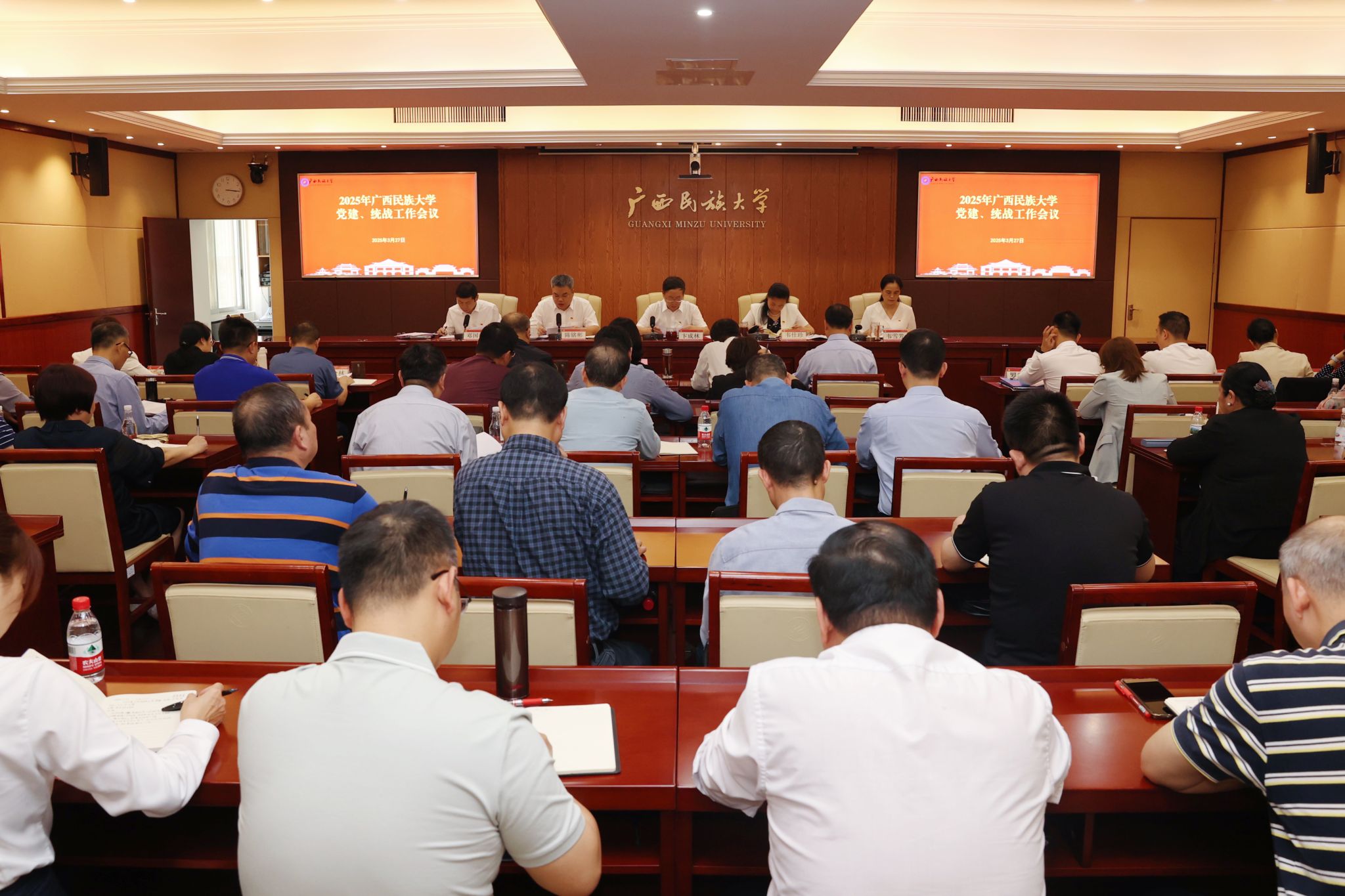 3月27日,廣西民族大學召開2025年黨建、統戰工作會議,校黨委書記卞成林出席會議并講話,黨委副書記、校長韋仕珍主持會議,黨委副書記陳銘彬作2025年黨建、統戰工作報告,校領導韋雪芳、鄧國彬、蔡高根、黃曉娟、何立榮、姜明國出席會議。