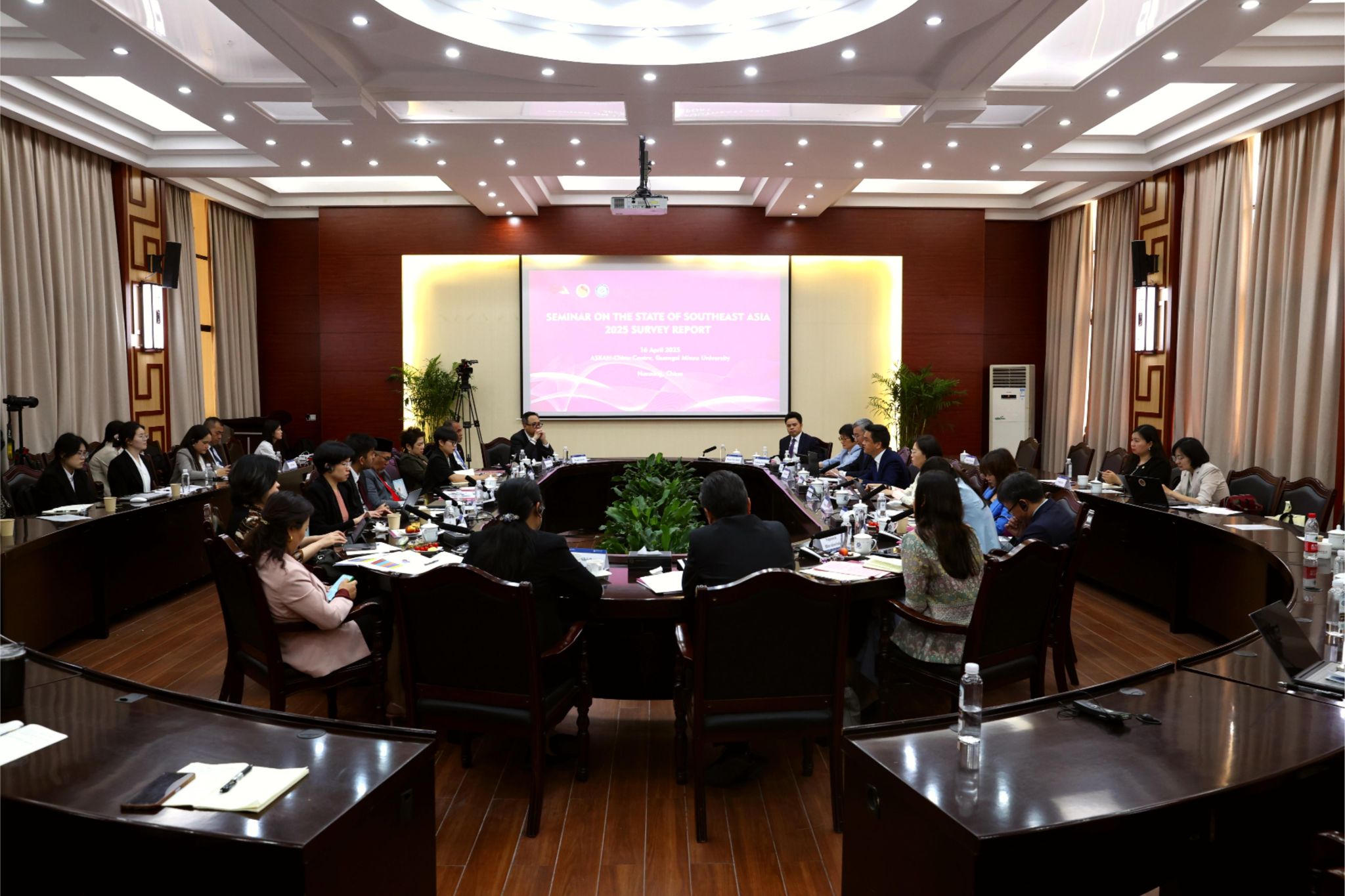 【大學生通訊社報道】4月16日上午,2025年東南亞國家調查報告研討會在廣西民族大學召開。廣西民族大學校長韋仕珍,中國-東盟中心秘書長史忠俊,泰國、柬埔寨、馬來西亞、緬甸駐南寧總領事館總領事及越南駐南寧總領事館官員出席研討會。來自中國、新加坡、泰國、文萊、馬來西亞、印度尼西亞、越南的學者參加研討會。