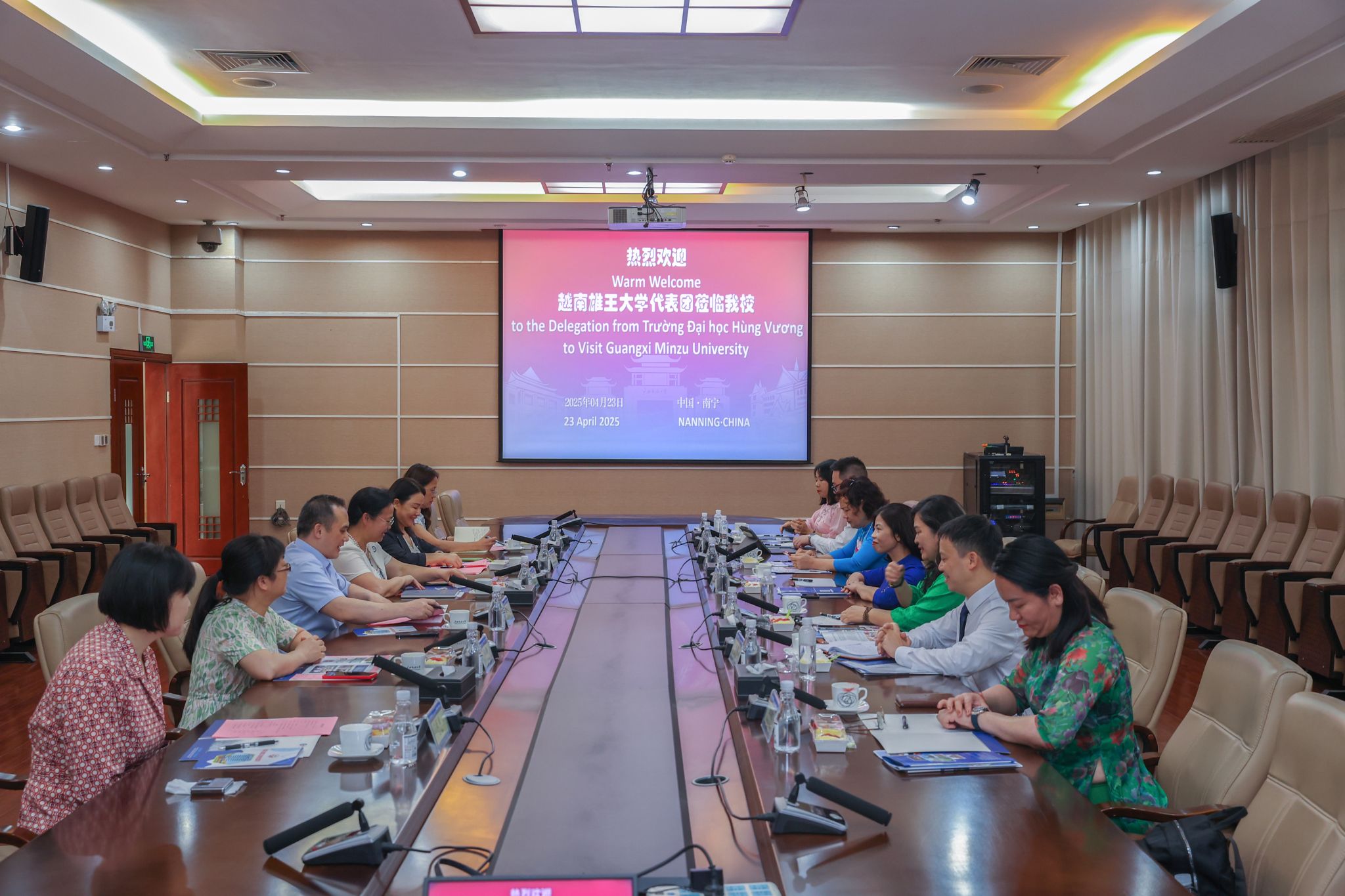 【大學(xué)生通訊社報道】4月23日上午,廣西民族大學(xué)校長韋仕珍會見來訪的越南雄王大學(xué)副校長潘氏情一行,雙方在國際教育綜合樓一樓會議室舉行座談會。