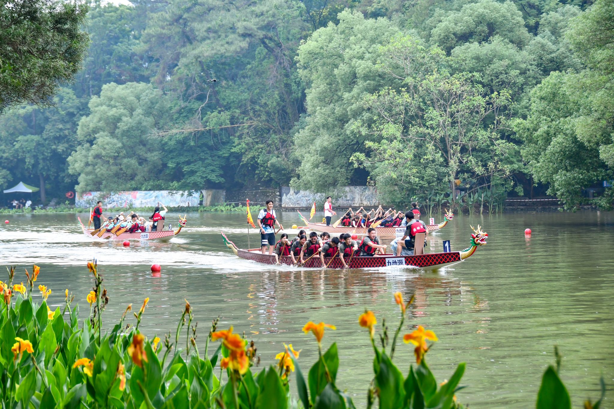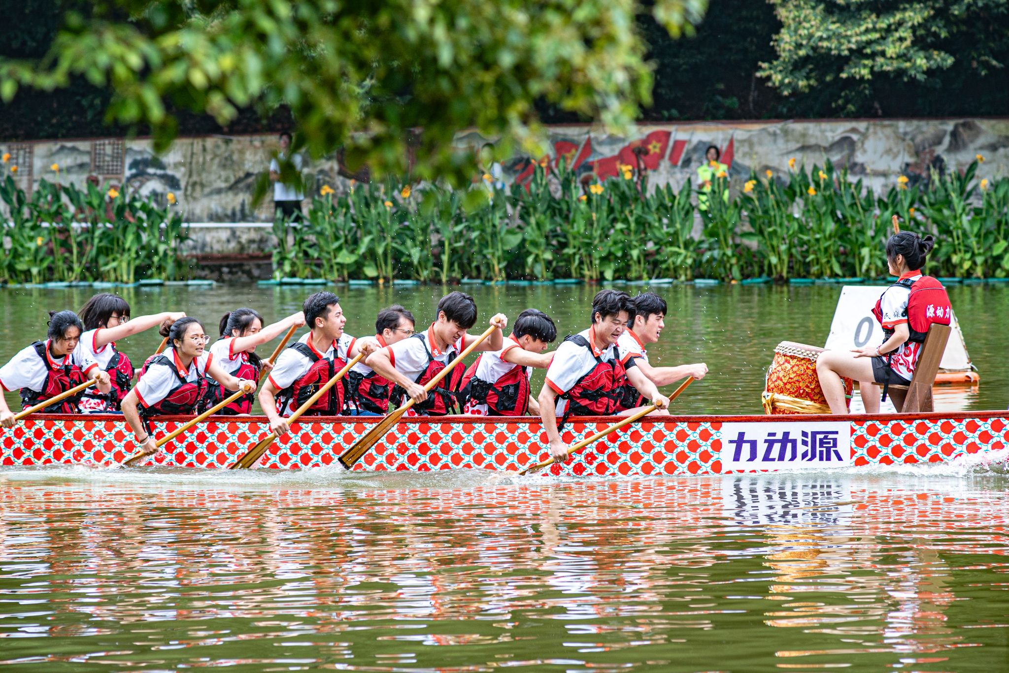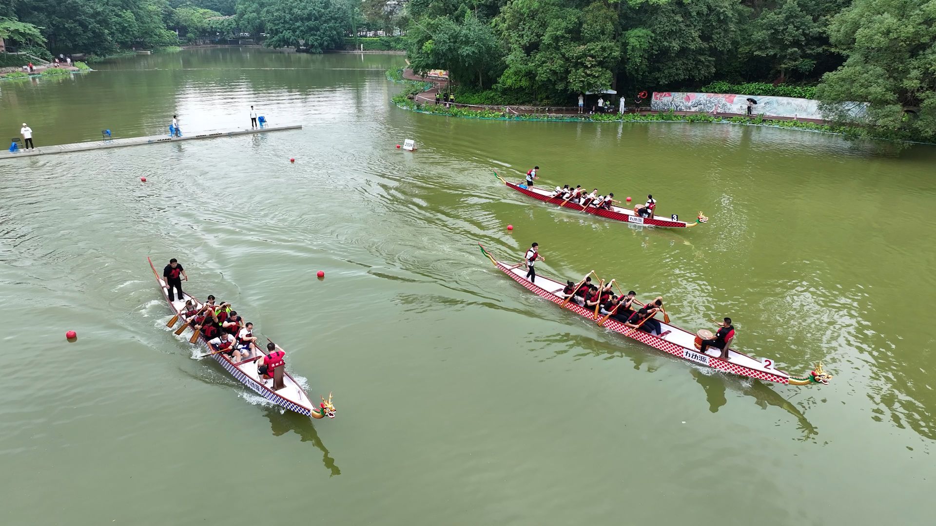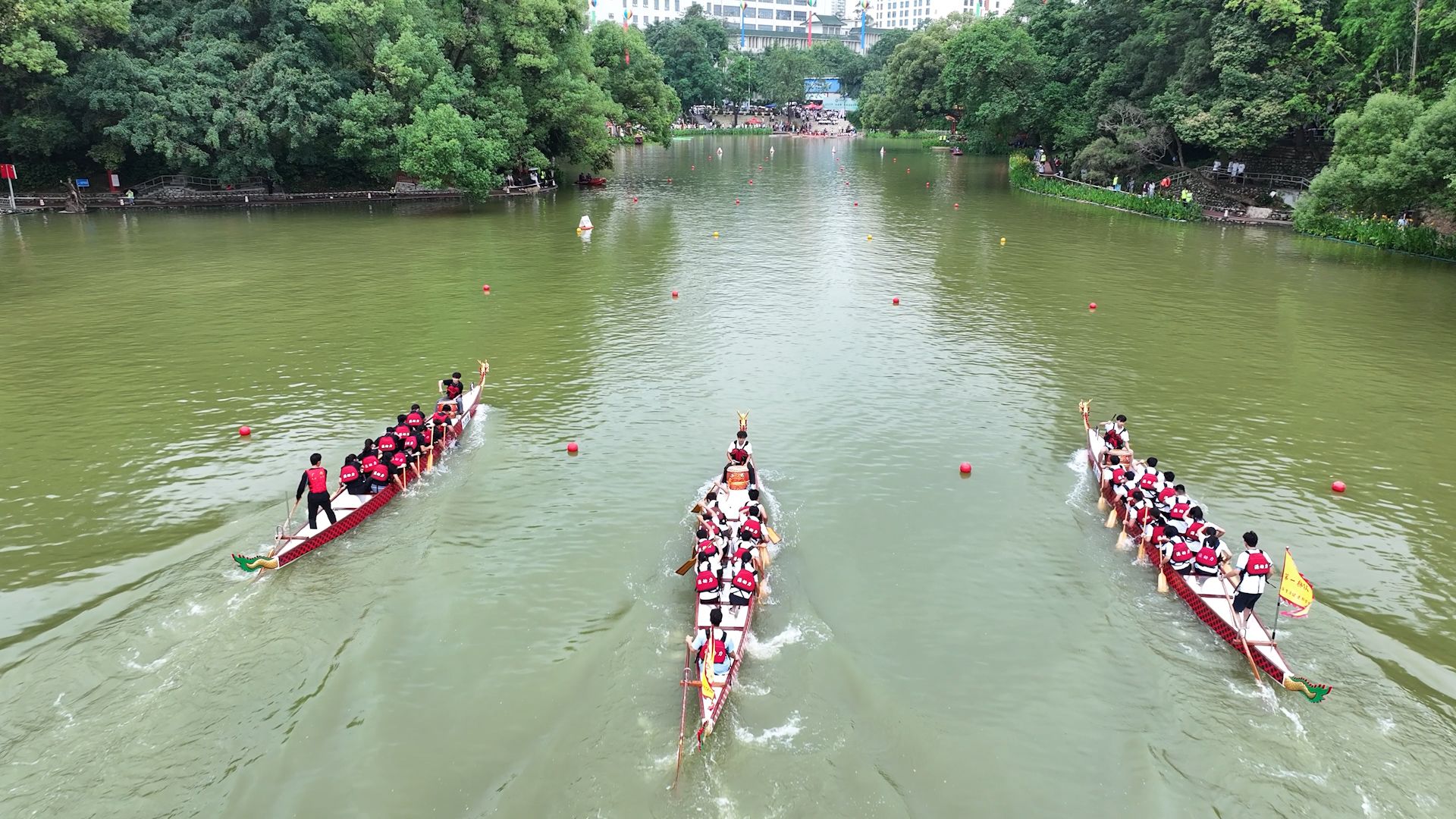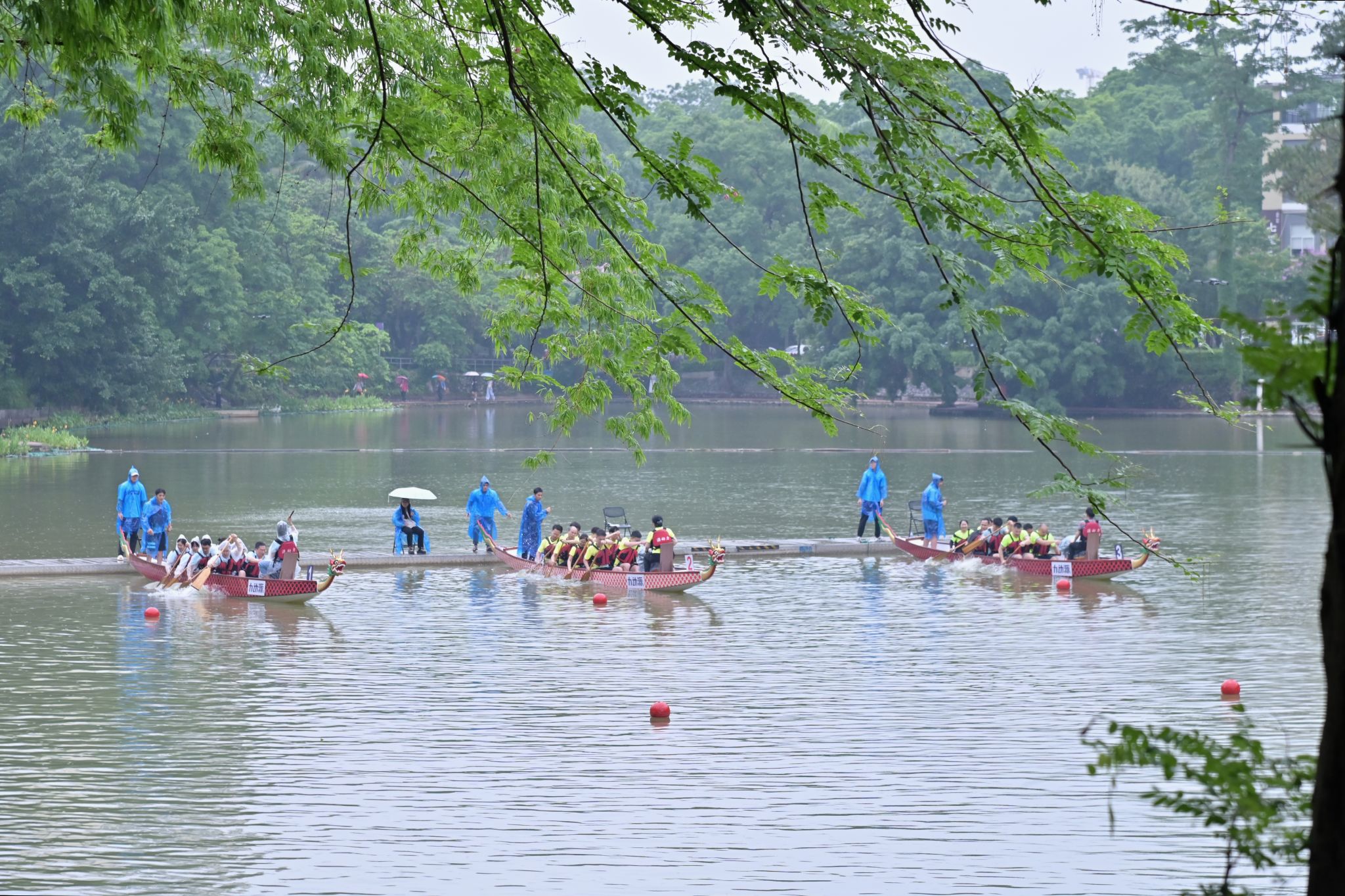 上午9時許,伴隨著震天鼓聲,比賽正式開始。發號聲響,河中龍舟猶如蛟龍出水,勢如破竹,極速前進。鼓手奮力擊鼓,槳手們齊喊口號、揮槳如飛,彼此配合默契,動作整齊劃一,平靜的湖面水花四濺,激起一陣陣波瀾。現場熱鬧非凡,鼓聲、吶喊聲、加油聲、口號聲此起彼伏,奏響拼搏奮斗的激昂樂章。