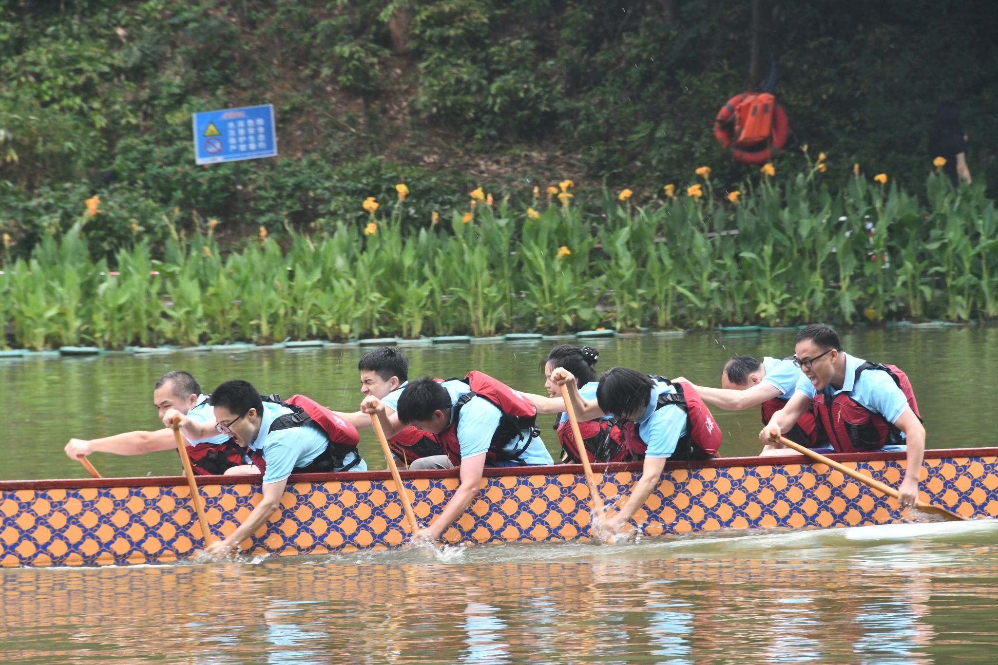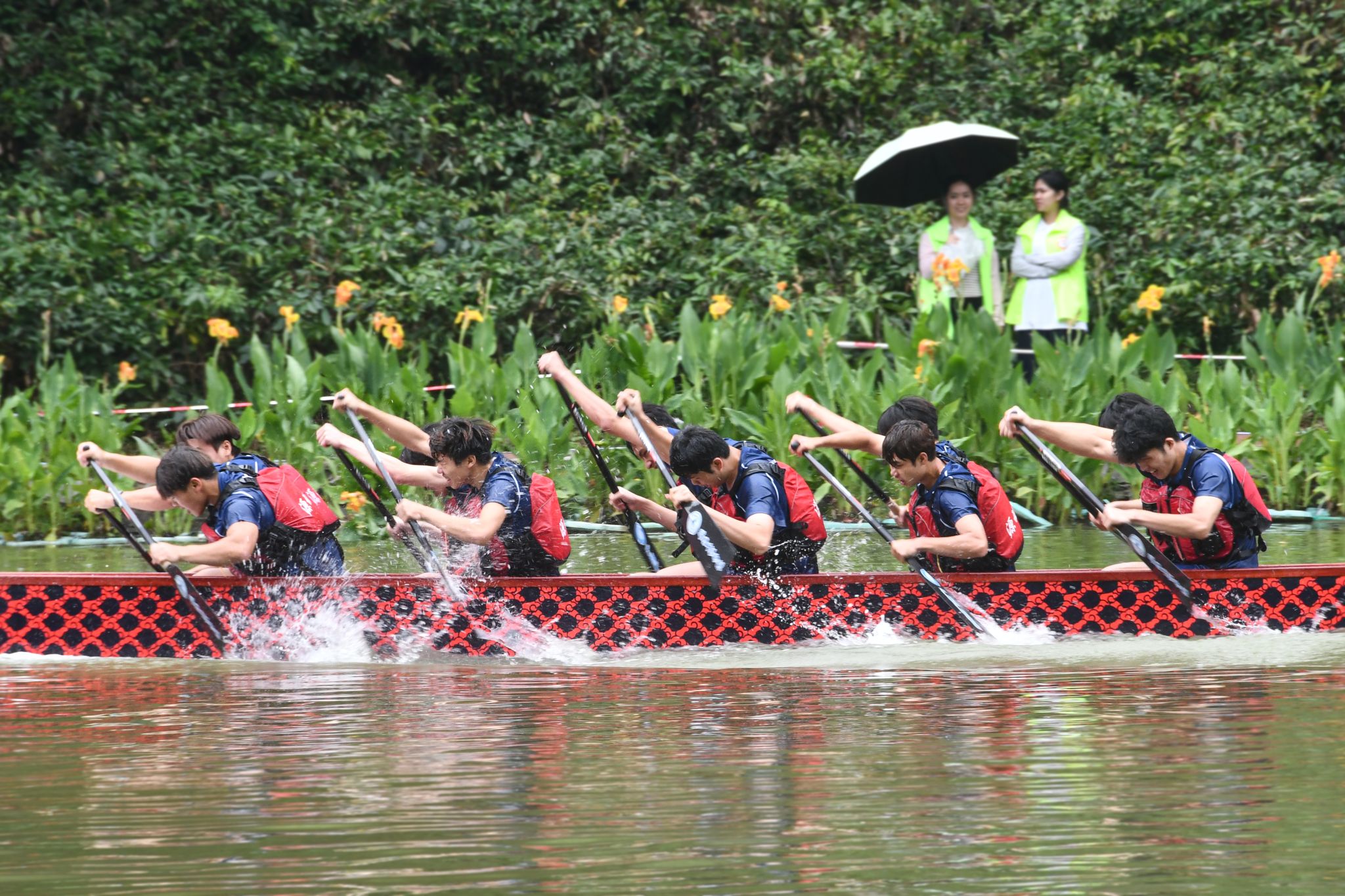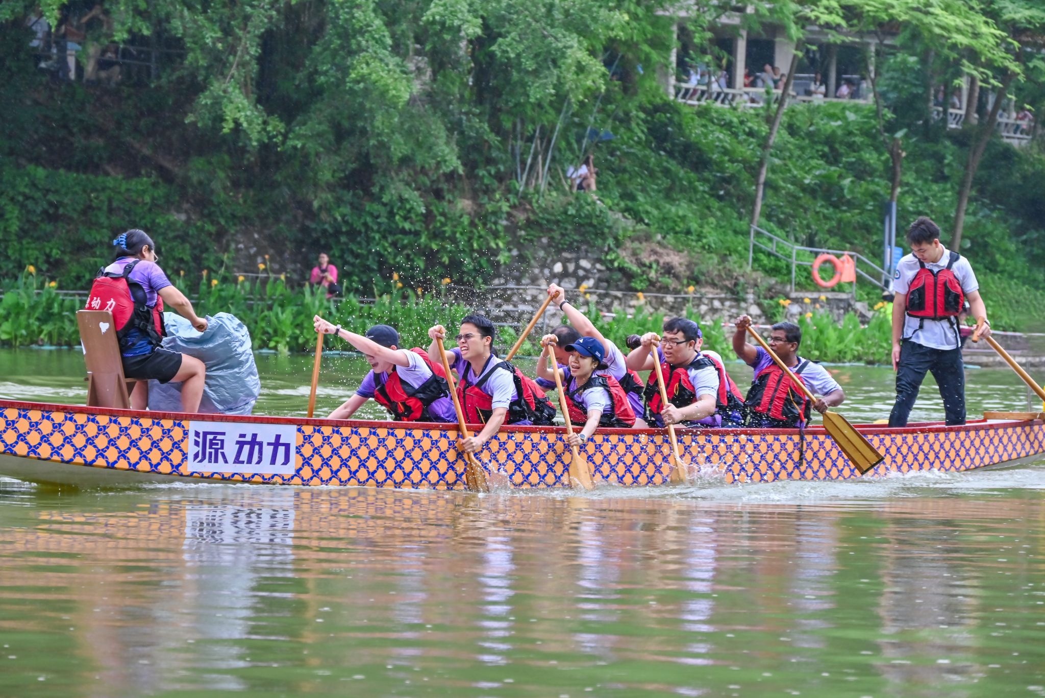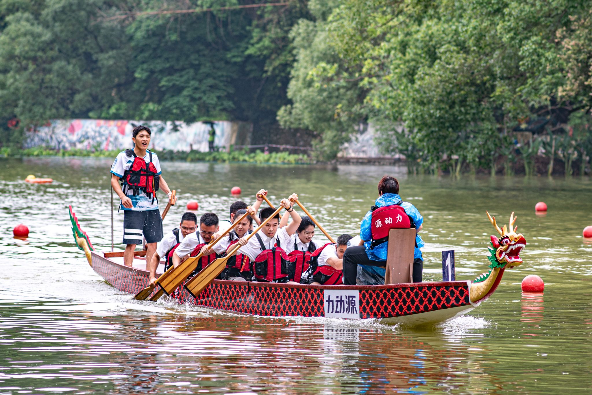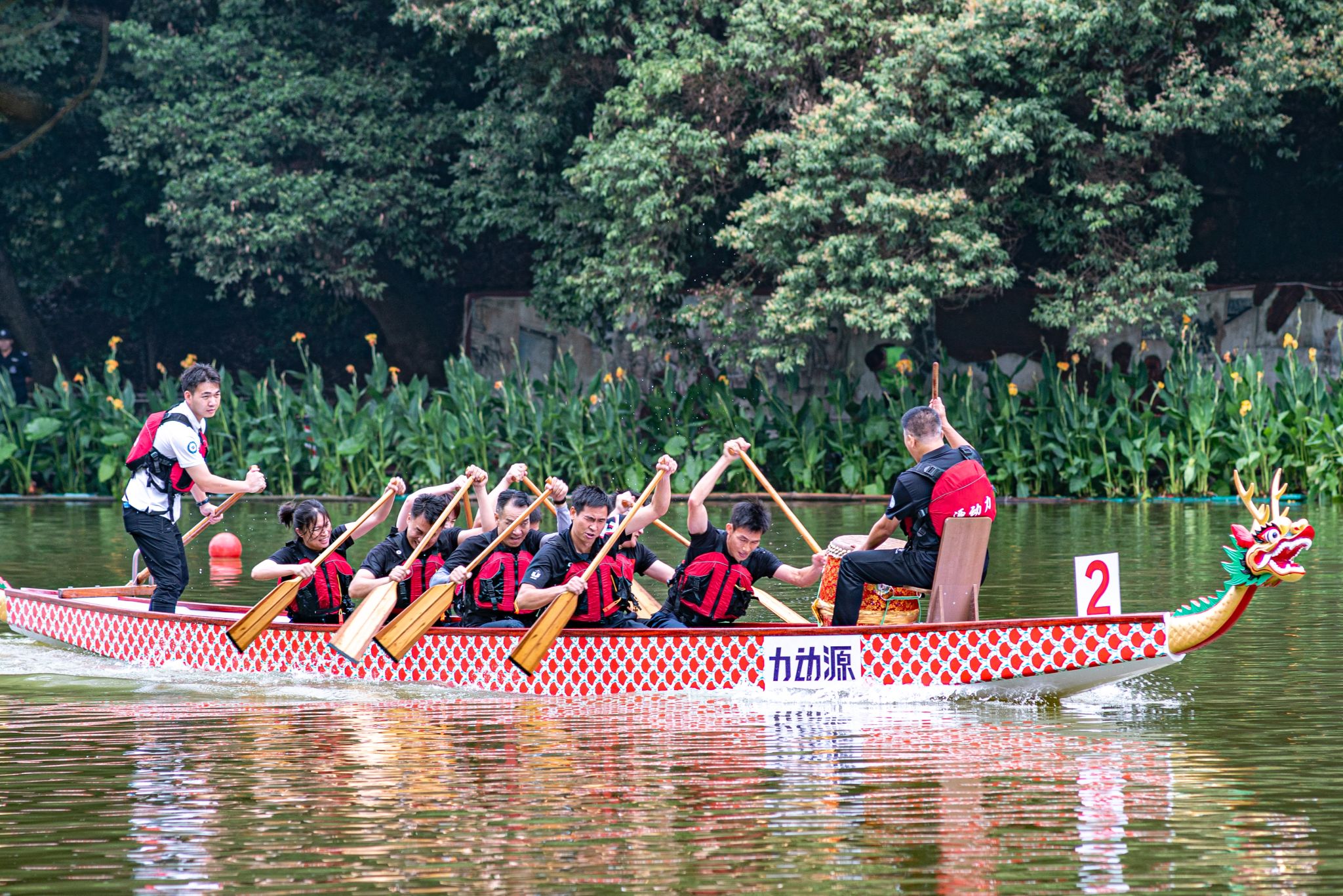 上午9時許,伴隨著震天鼓聲,比賽正式開始。發號聲響,河中龍舟猶如蛟龍出水,勢如破竹,極速前進。鼓手奮力擊鼓,槳手們齊喊口號、揮槳如飛,彼此配合默契,動作整齊劃一,平靜的湖面水花四濺,激起一陣陣波瀾。現場熱鬧非凡,鼓聲、吶喊聲、加油聲、口號聲此起彼伏,奏響拼搏奮斗的激昂樂章。
