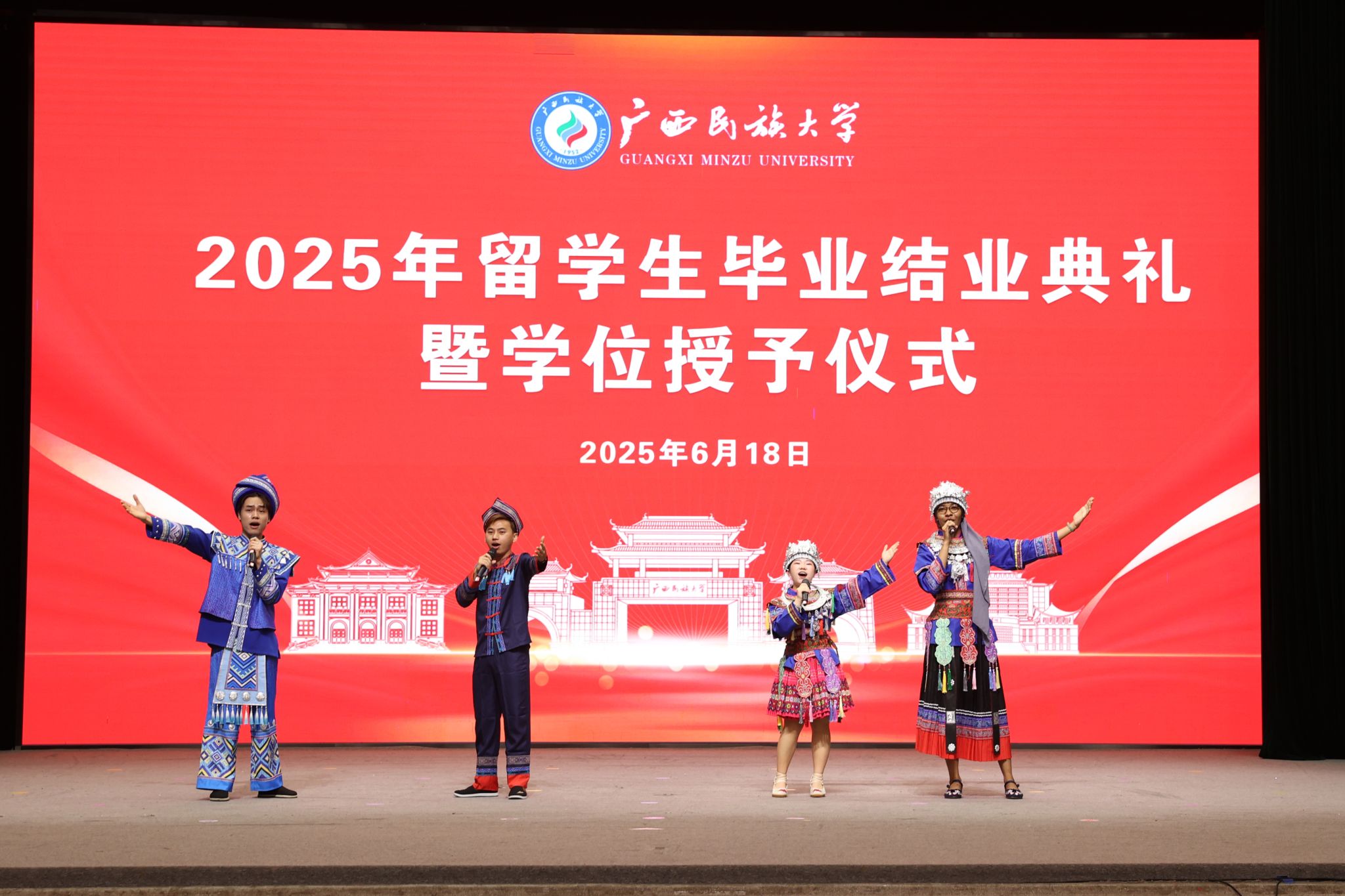 6月18日上午,廣西民族大學在相思湖校區大禮堂舉行2025年留學生畢業結業典禮暨學位授予儀式,校長韋仕珍出席活動并致辭,副校長何立榮主持,學校有關職能部門負責人、各學院教師代表及500余名在校畢業、結業留學生與會。