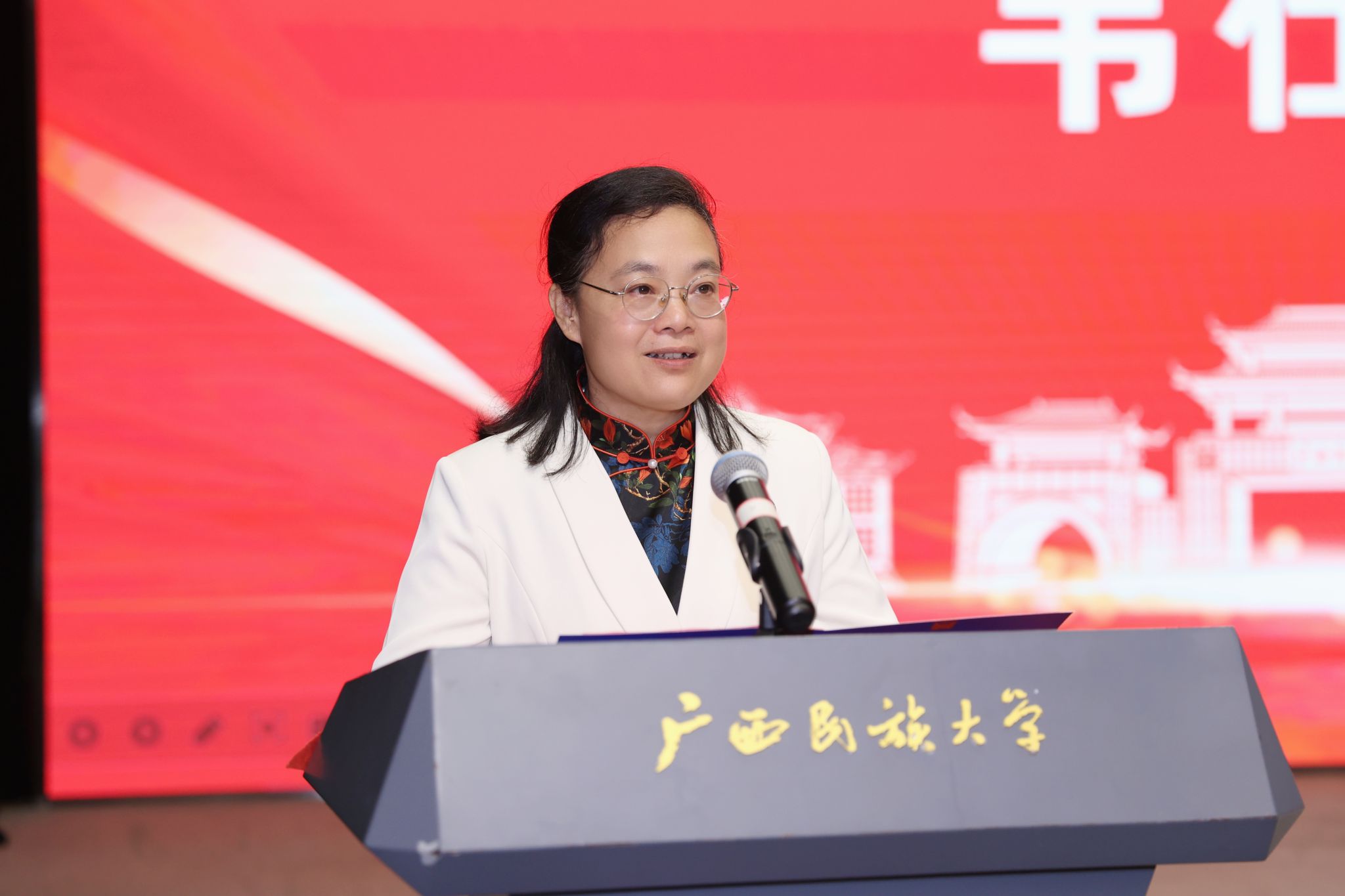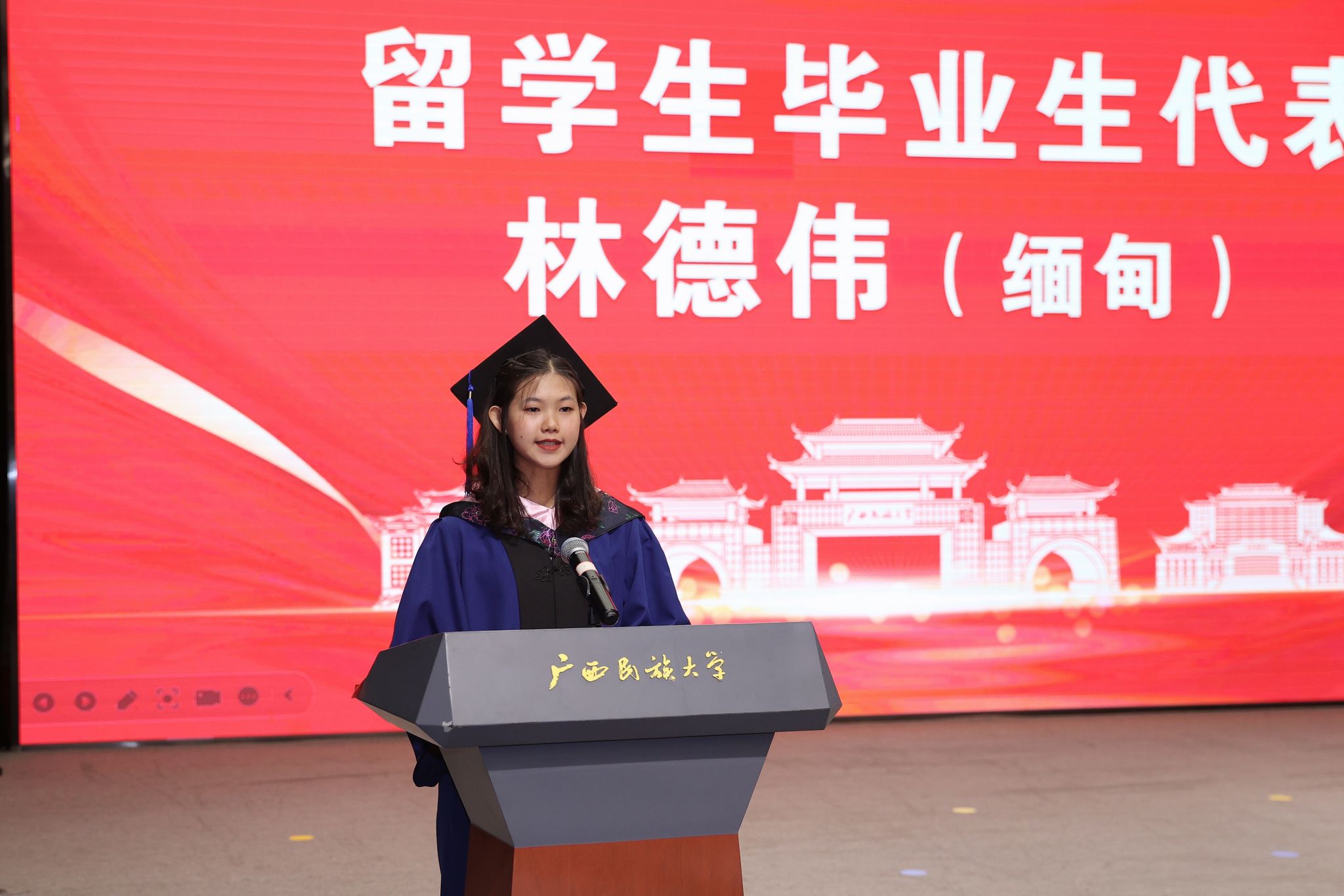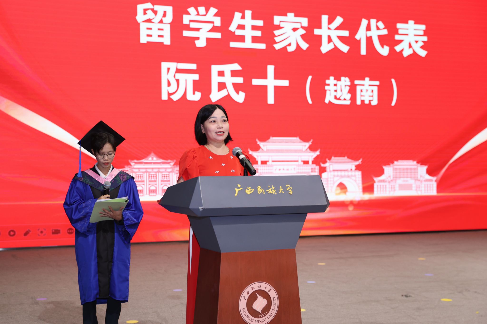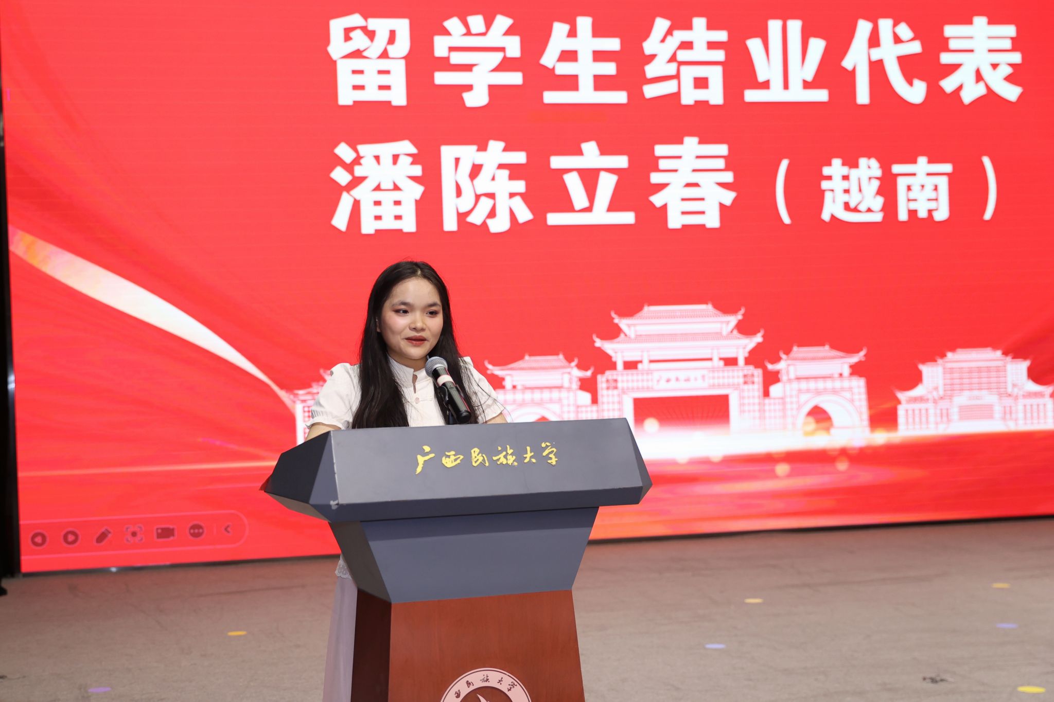 韋仕珍代表學校向來自布隆迪、老撾、馬來西亞等18個國家的留學生表示祝賀。她希望畢業留學生珍藏在廣西民族大學求學的美好記憶,心懷母校烙印,永存探索之心;將民大“厚德博學、和而不同”的校訓傳播到世界各地,以開放、尊重、共情的心態,向世界講述真實、立體、多彩的中國故事與故鄉文化,成為構建人類命運共同體進程中最具感召力與親和力的文明使者。