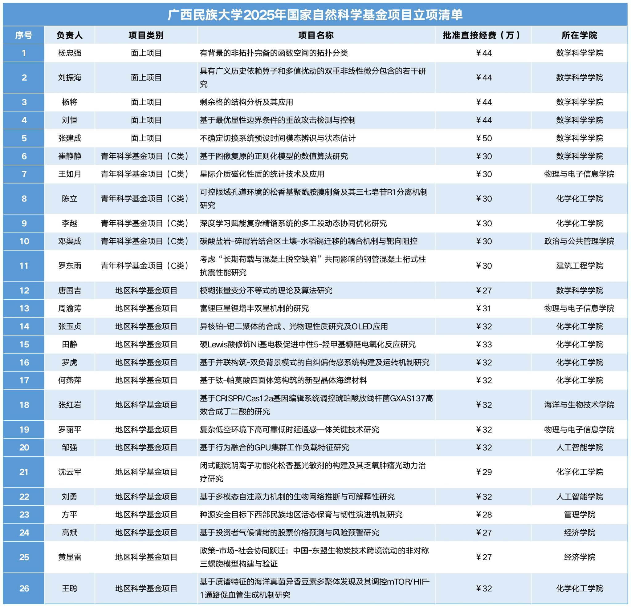 8月27日,國家自然科學基金委員會公布了2025年集中接收申請項目評審結果,廣西民族大學共有26個項目獲得立項資助,直接經費合計864萬元,其中面上項目5項,青年科學基金項目(C類)6項,地區科學基金項目15項,立項數量和資助金額保持穩步增長,尤其在面上項目上實現了重大突破。