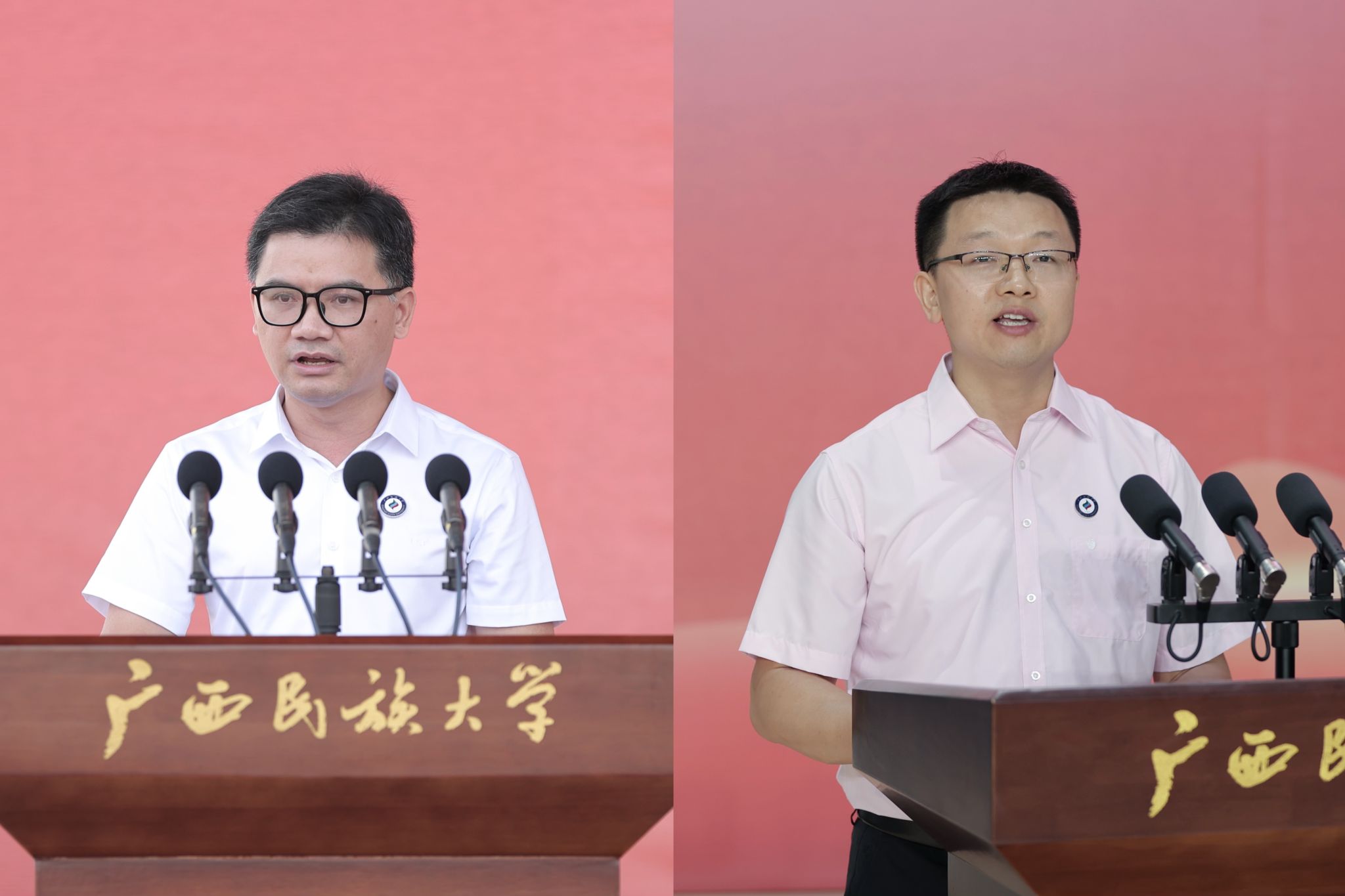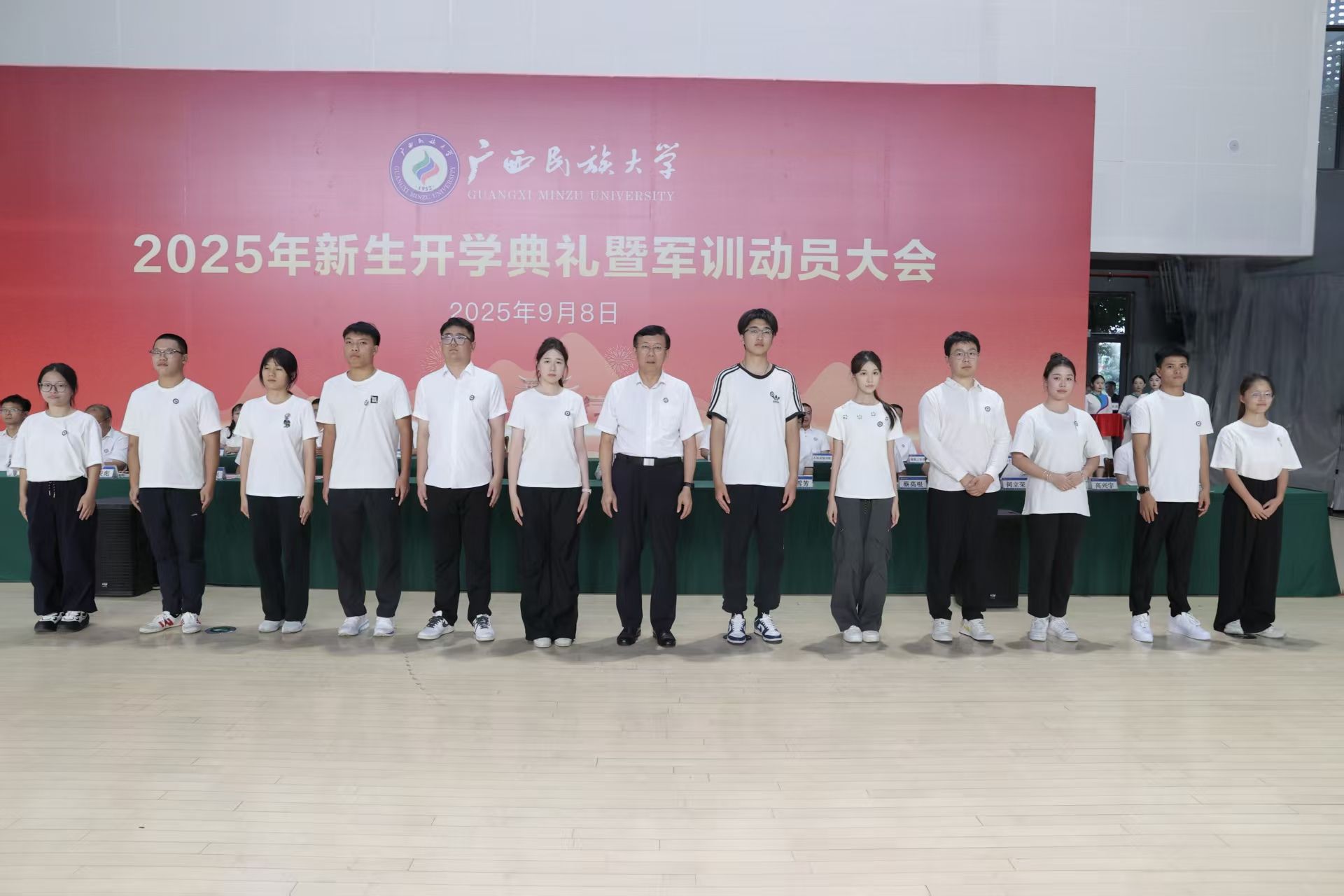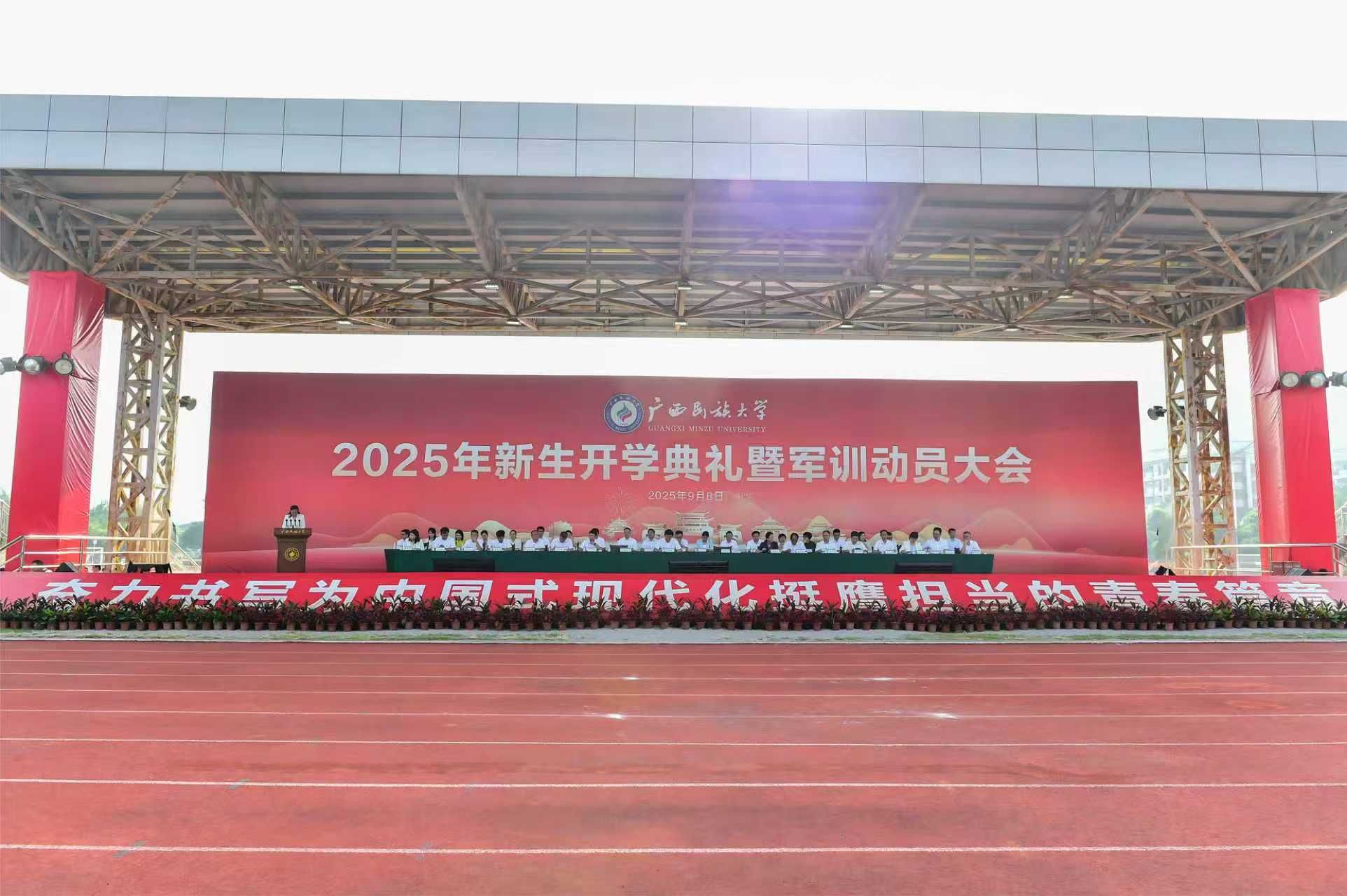 【大學生通訊社報道】9月8日,廣西民族大學2025年新生開學典禮在思源湖校區李寧田徑場、武鳴校區體育館舉行。校黨委書記唐平秋出席并為新生代表贈送校徽徽章,校長韋仕珍出席并講話,校領導陳銘彬、韋雪芳、鄧國彬、蔡高根、呂俊彪、何立榮、姜明國、高興宇出席,學校有關職能部門、各學院負責人、教師代表、輔導員、班主任及2025級全體新生參加。典禮由校黨委副書記陳銘彬主持。