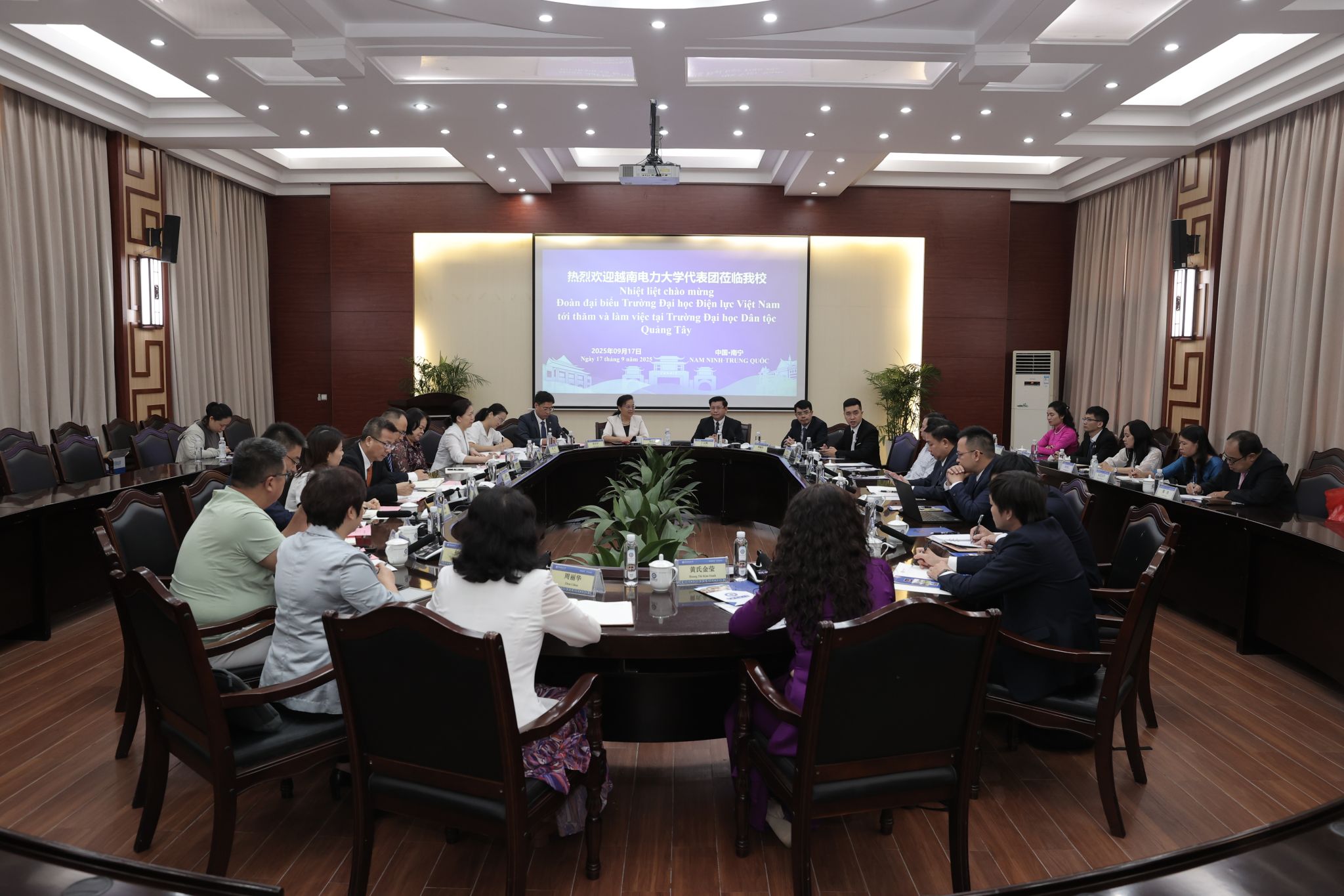 【大學生通訊社報道】9月17日上午,廣西民族大學校長韋仕珍會見來訪的越南電力大學校長丁文洲一行,雙方在國際合作與交流處大會議室交流座談,副校長高興宇主持。