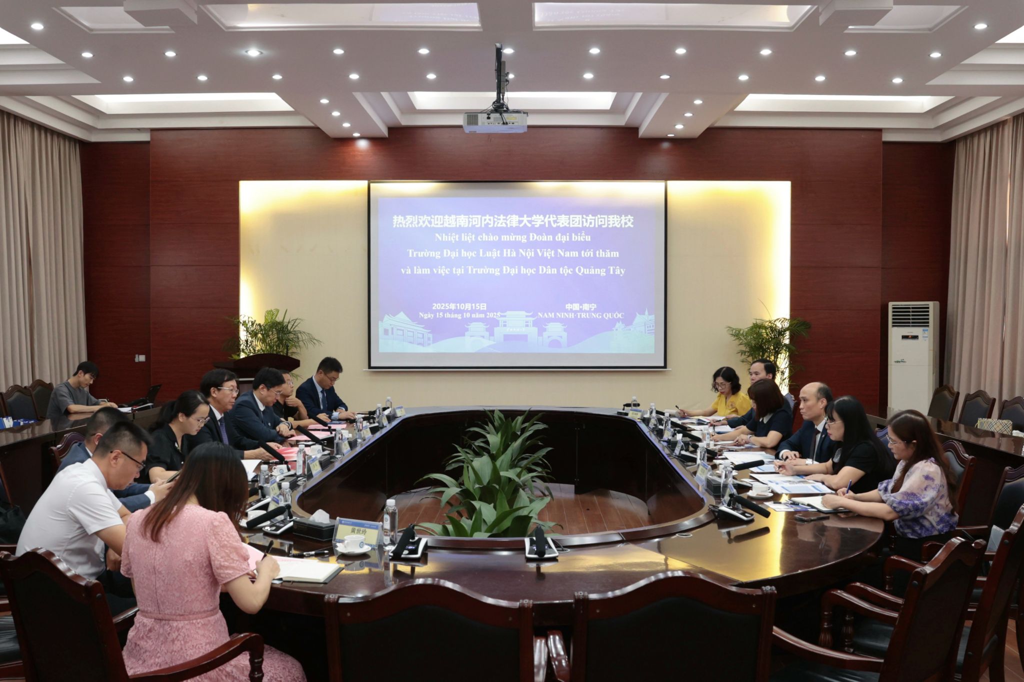 唐平秋對越南河內(nèi)法律大學(xué)代表團(tuán)的來訪表示歡迎,簡要介紹了學(xué)校辦學(xué)發(fā)展歷史。他表示,廣西民族大學(xué)高度重視與越南有關(guān)機構(gòu)及高校的合作交流,期待雙方充分發(fā)揮各自優(yōu)勢,深化拓展合作領(lǐng)域,為構(gòu)建中越命運共同體貢獻(xiàn)力量。