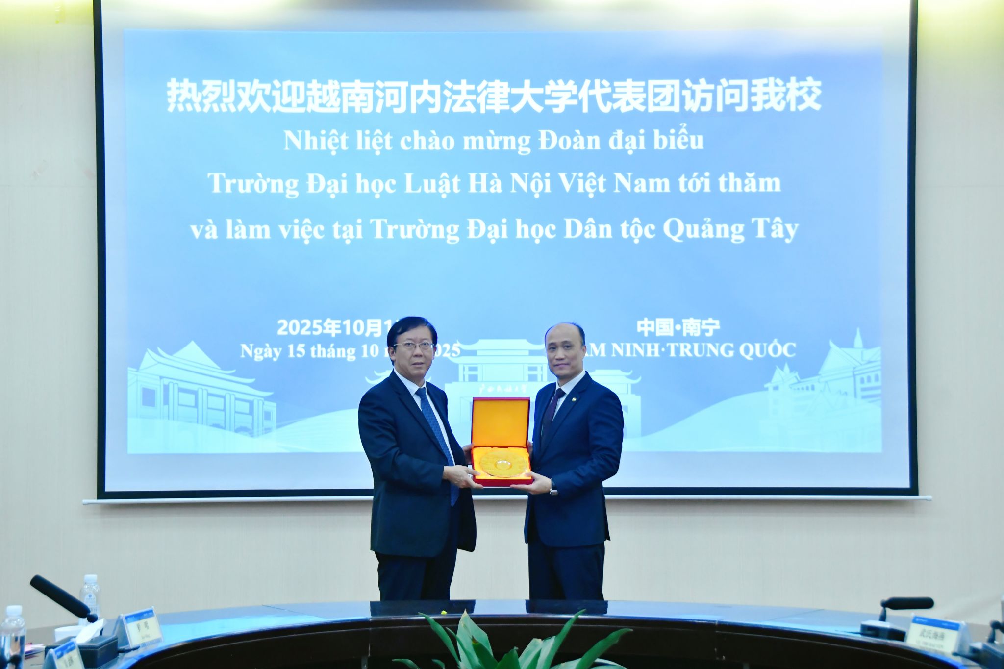 【大學(xué)生通訊社報道】10月15日下午,廣西民族大學(xué)黨委書記唐平秋會見來訪的越南河內(nèi)法律大學(xué)校長蘇文和一行。雙方在國際合作與交流處大會議室交流座談,副校長高興宇主持座談會。