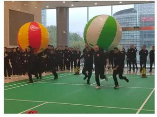 2.運轉乾坤:每隊6人,將運轉乾坤大球舉至頭頂,從起點開始,繞過標志物后,最先回到起點的隊伍為勝者。