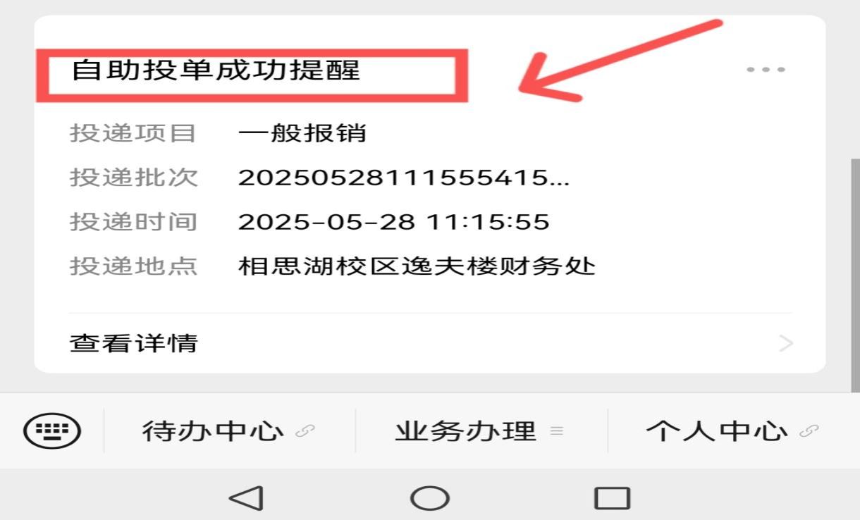 投單成功后,“廣西民族大學數智財務”微信公眾號會推送自助投單成功提醒到報銷申請人。