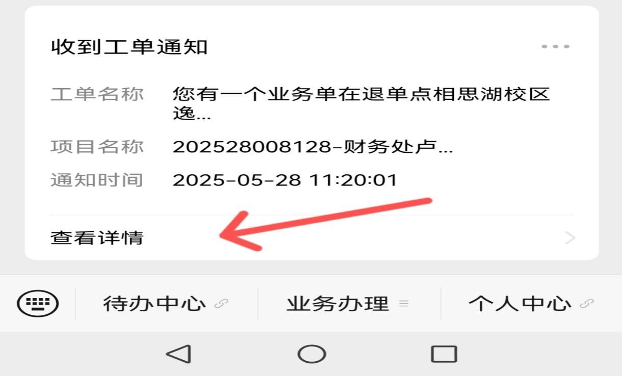 4.如發生退單,相關信息將通過微信公眾號信息推送形式通知報銷申請人。點擊“查看詳情”進入后,即可查看具體退單地點和取件碼。