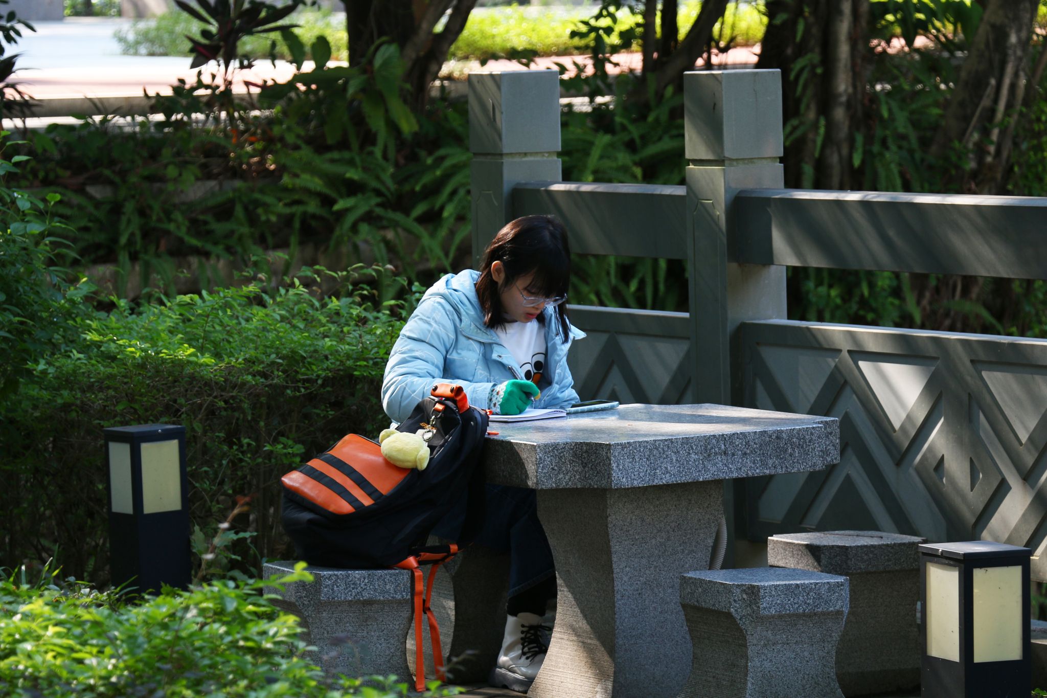 相思湖畔、圖書館前,雖已入冬,但樹木依舊翠綠,你和青蔥樹木,在陽光的照射下都格外迷人。