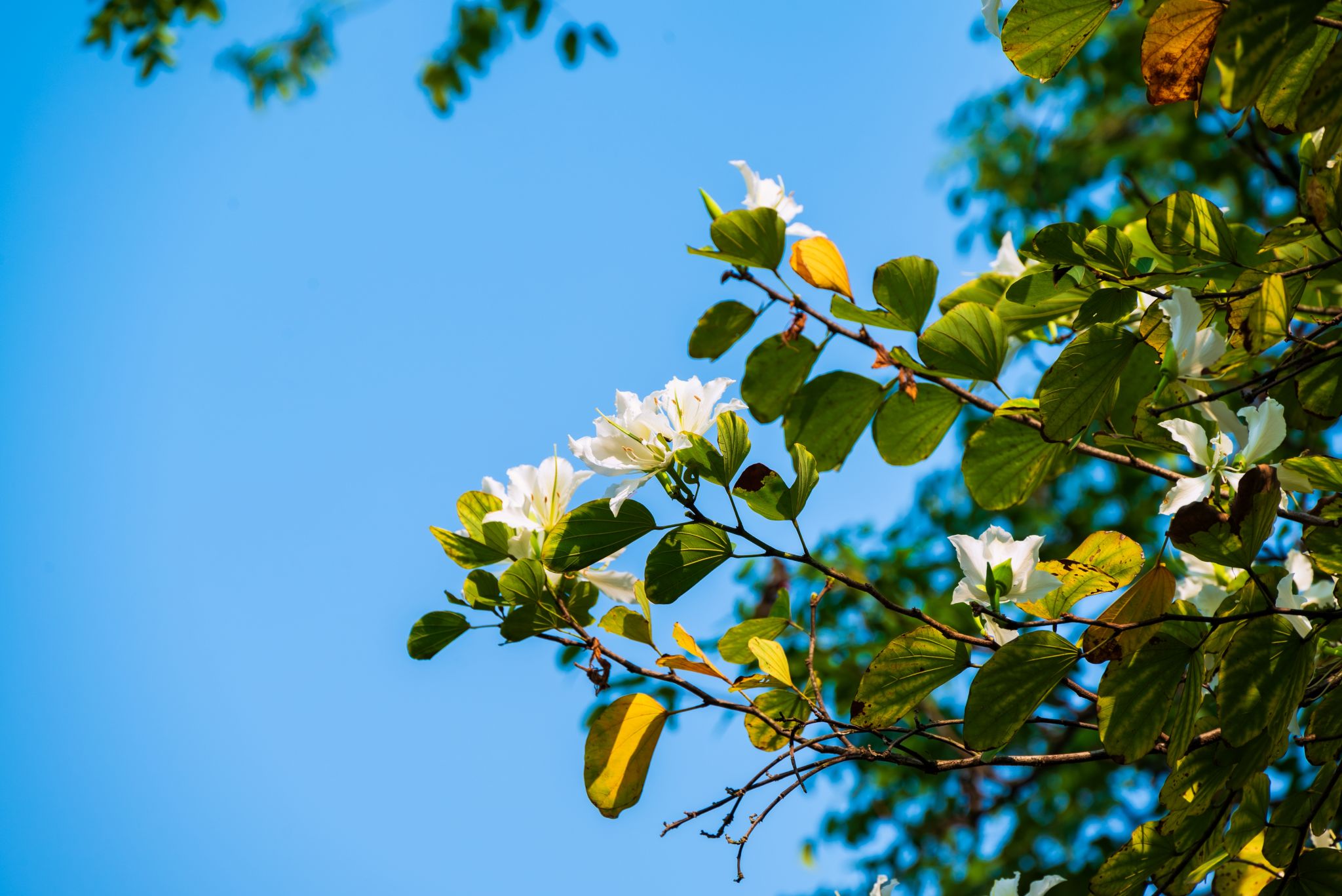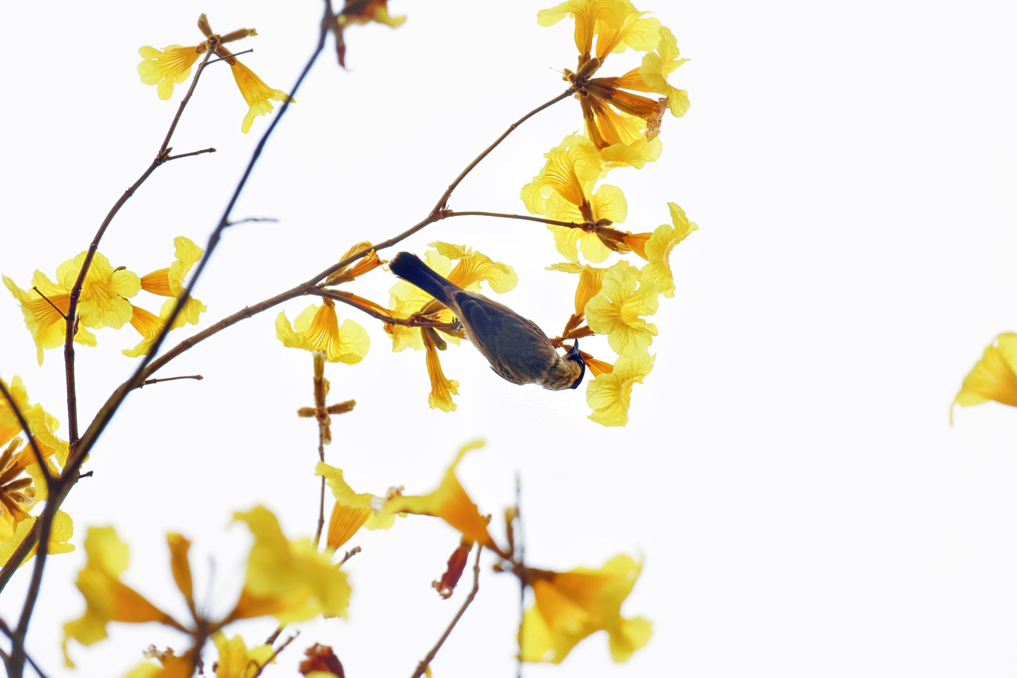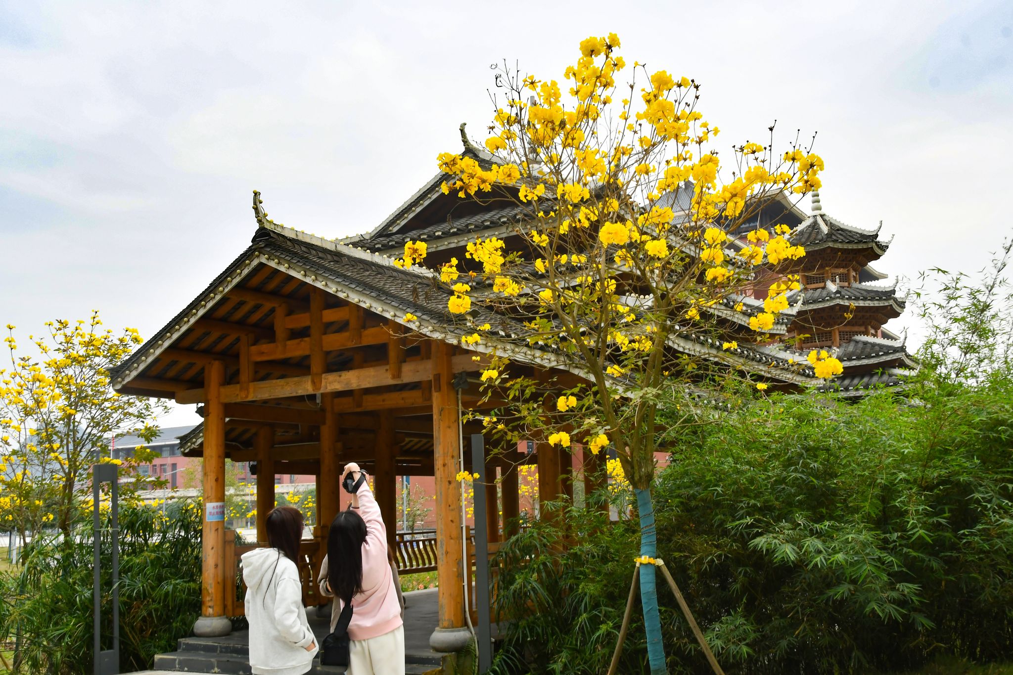 黃風鈴木綴枝頭,人影花影復重疊