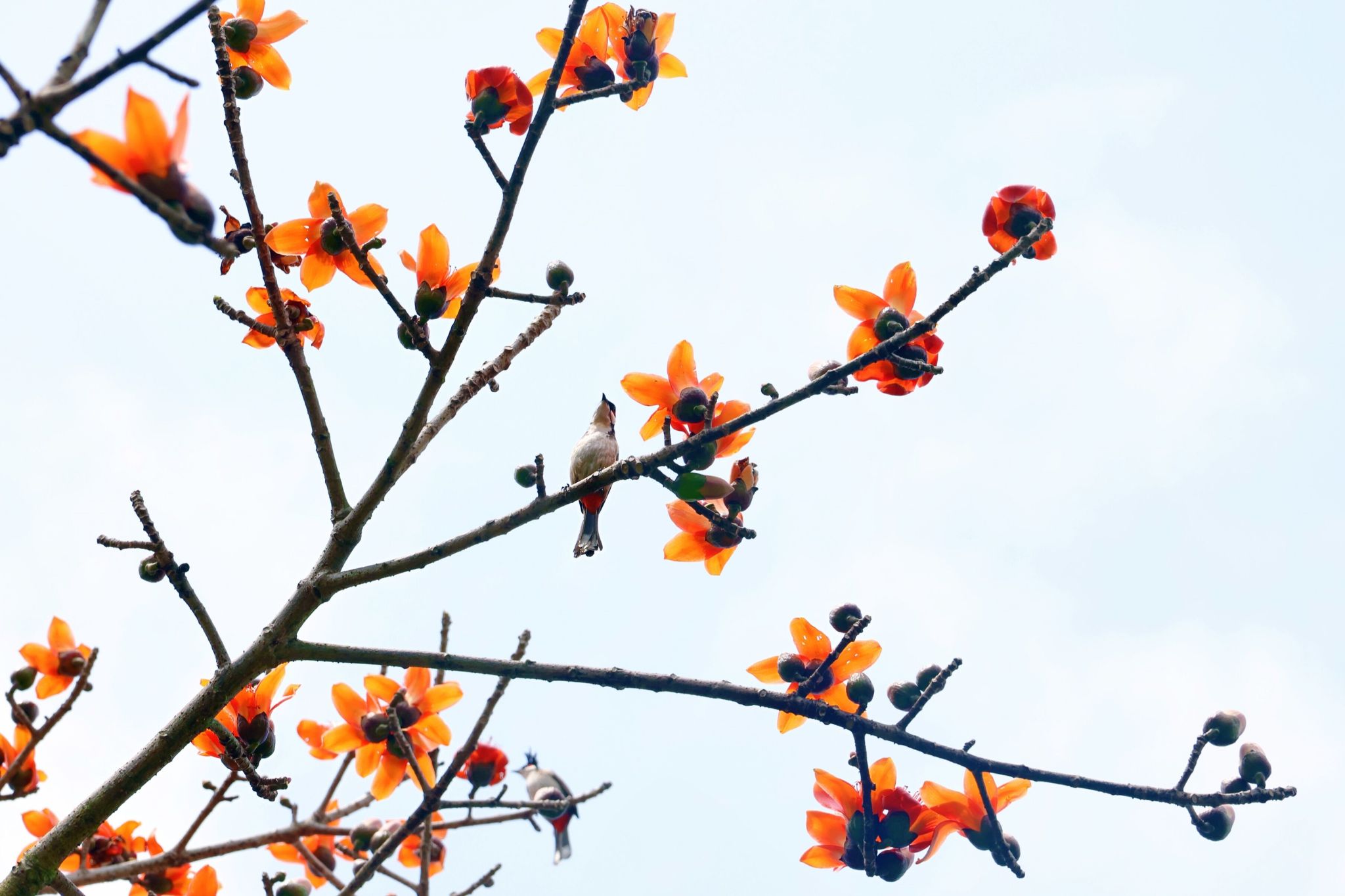 春風拂面花含笑,鳥兒休憩立枝頭
