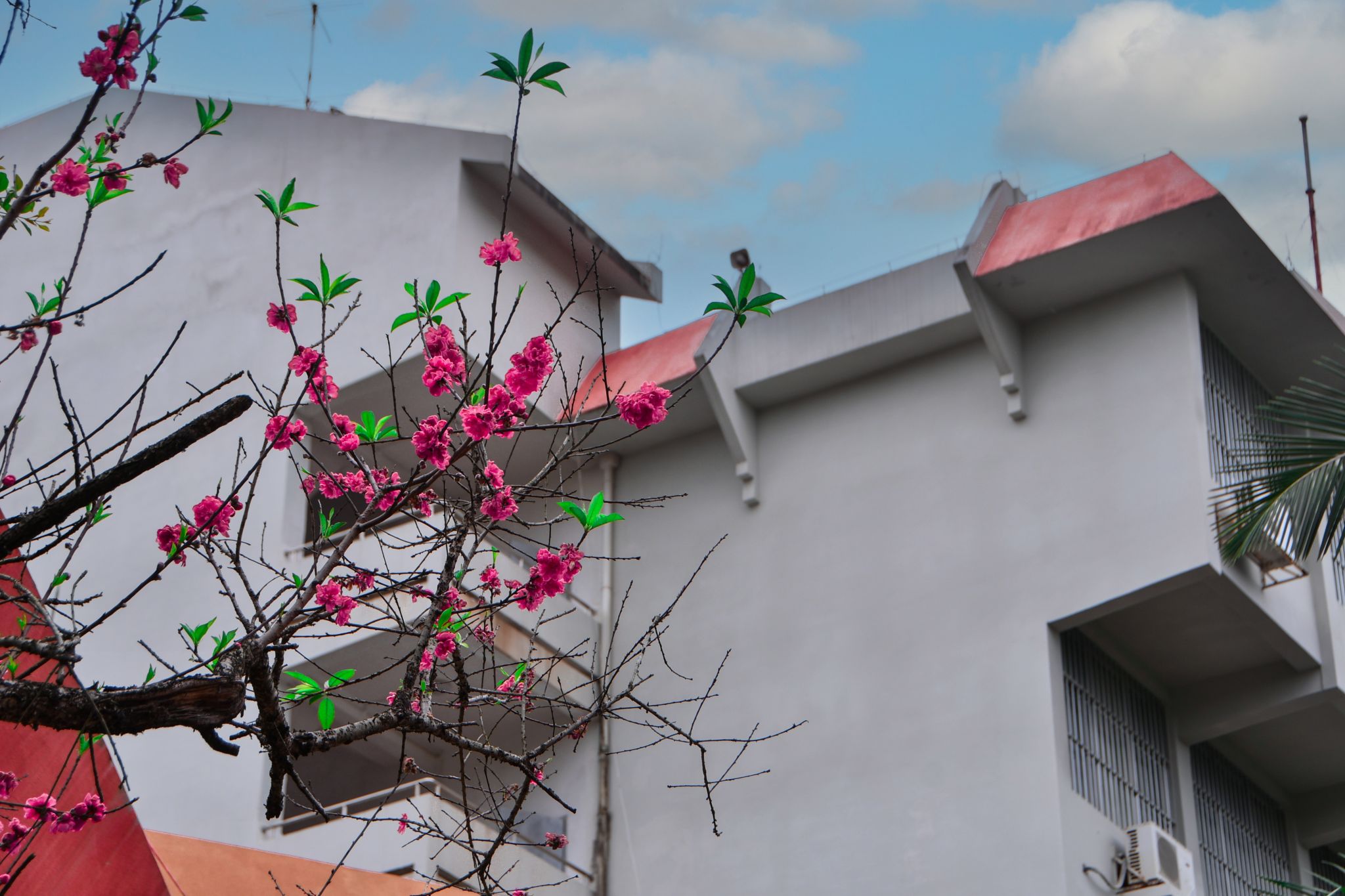 教學樓前梅花綻,疏影橫斜映朝陽
