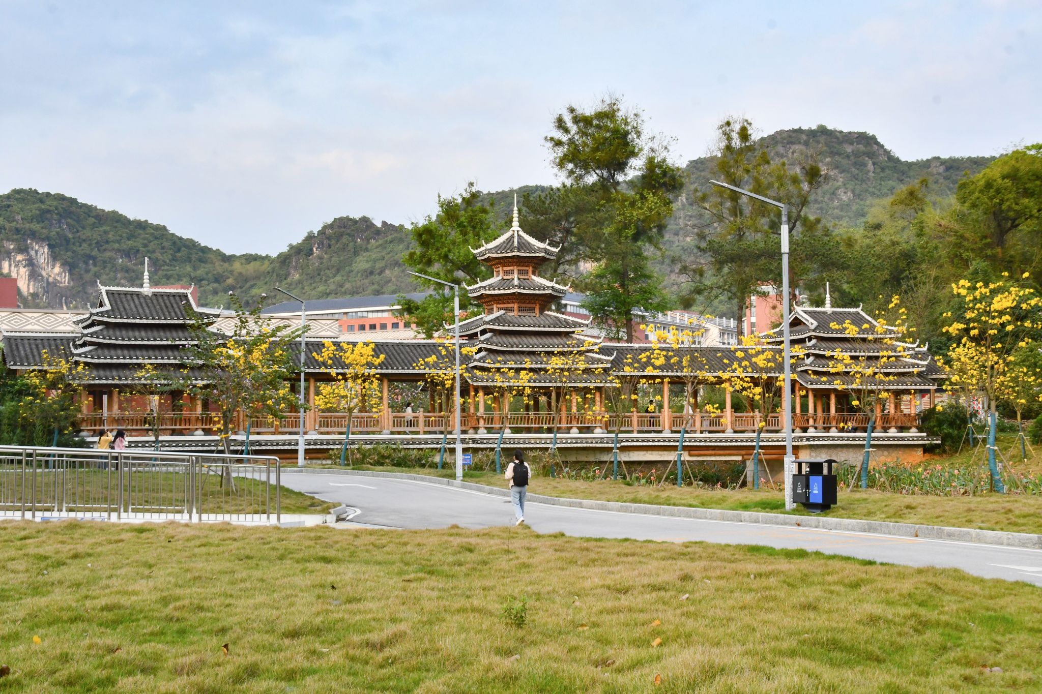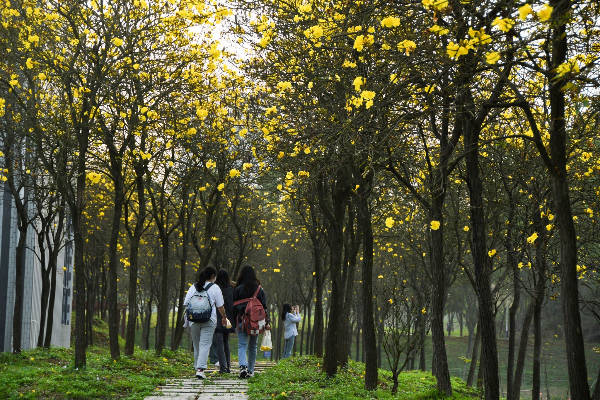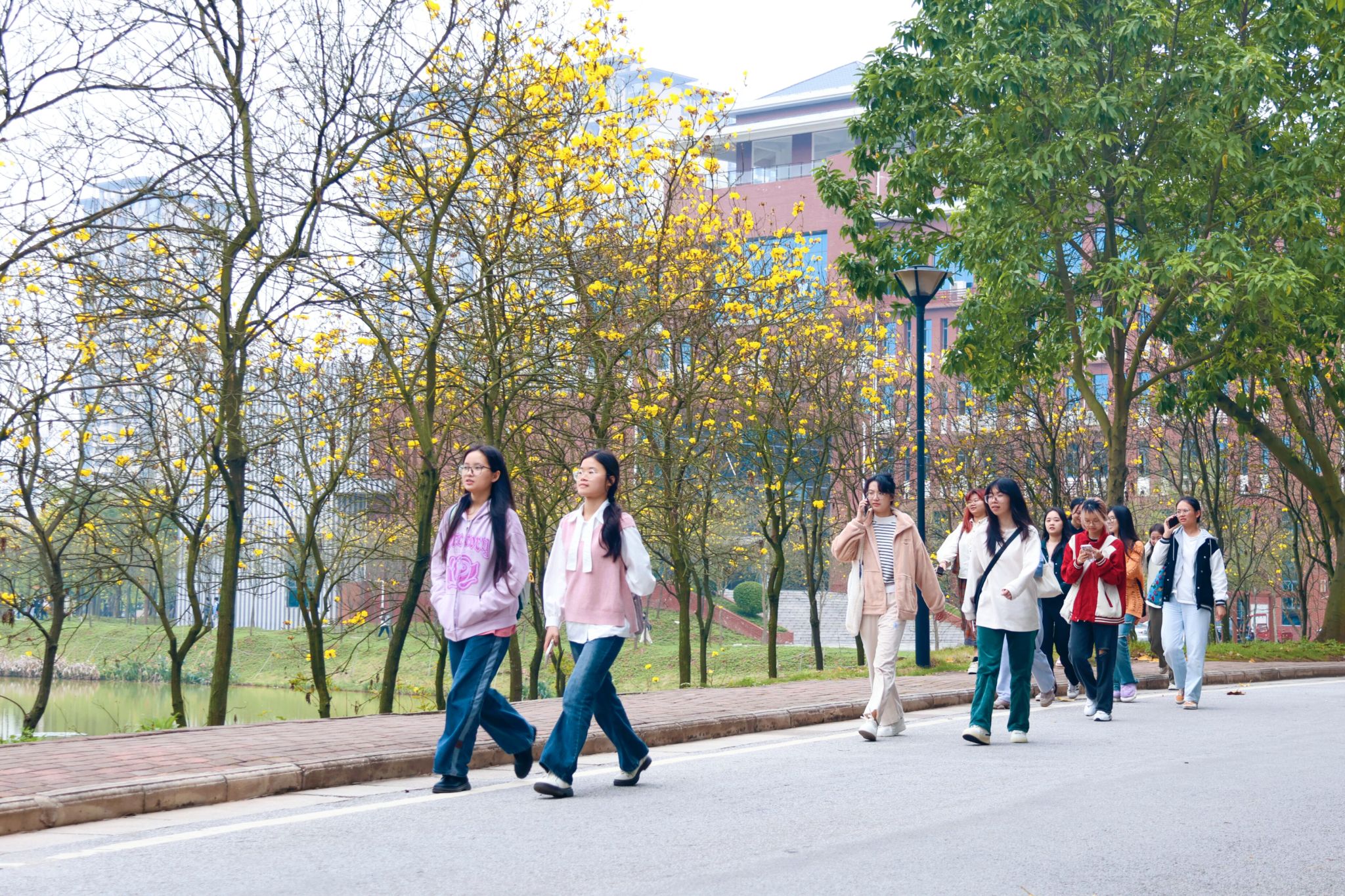 微風拂面,學子穿梭在樹蔭下