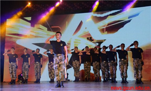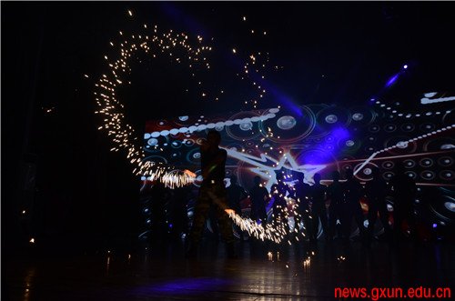 人武學(xué)院2014級(jí)學(xué)員軍舞表演《青春士兵》把軍事元素與街舞相結(jié)合,一名士兵出現(xiàn)在舞臺(tái)中央,揮動(dòng)手中燃燒著的雙節(jié)棍,飛舞的火花給黑暗的舞臺(tái)帶來一絲光亮,展示了人武學(xué)院學(xué)子無所畏懼的精神風(fēng)貌。