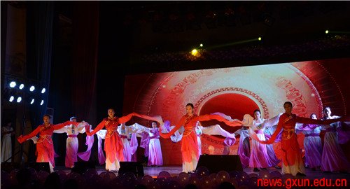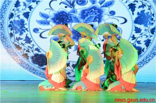 “天青色等煙雨,而我在等你…… ”9名身著白綢緞衣服的女子,手拿折扇伴著輕柔的音樂翩翩起舞,廣西農(nóng)業(yè)職業(yè)技術(shù)學(xué)院的民族舞《青花瓷》仿佛將觀眾帶到那煙雨朦朧的江南美景中。廣西國際商務(wù)職業(yè)技術(shù)學(xué)院、廣西藝術(shù)學(xué)院、廣西幼兒師范高等??茖W(xué)校等駐邕高校通過節(jié)目表演,祝福人武學(xué)院建院二十周年。