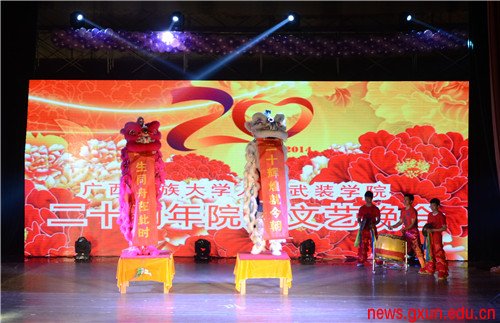 在鏗鏘的鑼鼓聲中,廣西機(jī)電職業(yè)技術(shù)學(xué)院與南寧職業(yè)技術(shù)學(xué)院武術(shù)協(xié)會(huì)聯(lián)袂表演的醒獅拉開晚會(huì)序幕。一紅一白兩頭獅子在舞臺(tái)上你追我趕,搖頭擺尾,并送上“一生同舟在此時(shí),二十輝煌就今朝”的真誠祝福。