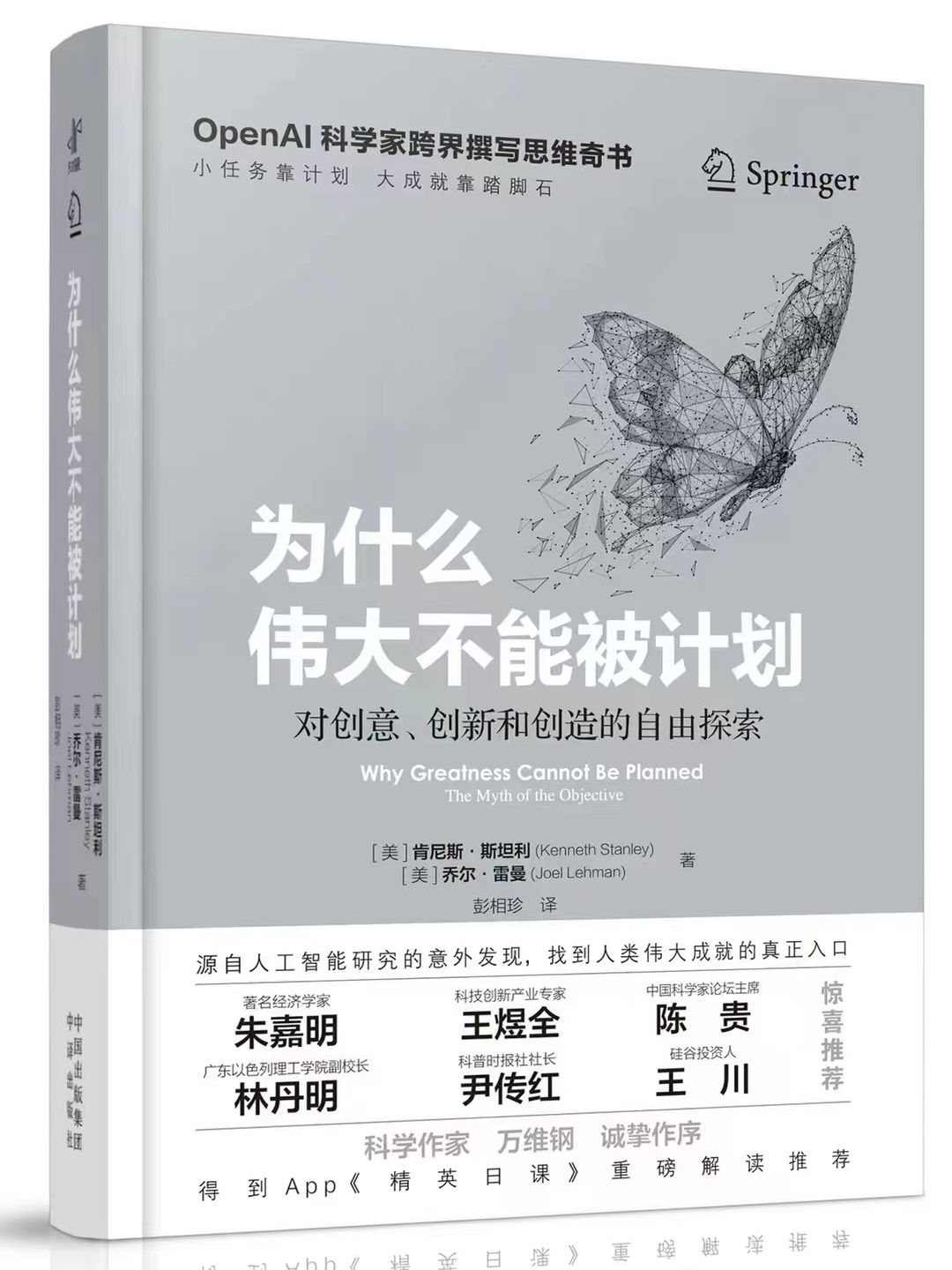 《為什么偉大不能被計(jì)劃》是2023年中國(guó)出版集團(tuán)中譯出版社出版的圖書,作者是肯尼斯·斯坦利(Kenneth Stanley)、喬爾·雷曼(Joel Lehman),這是一本探討創(chuàng)新與偉大成就本質(zhì)的書籍。作者通過(guò)深入研究,提出偉大往往不是預(yù)先計(jì)劃的,而是依賴于人類的創(chuàng)造力和自由意志。作者通過(guò)多個(gè)案例研究,展示了偉大成就背后的真正邏輯,鼓勵(lì)讀者珍視自由,勇于探索,追求真正的偉大。