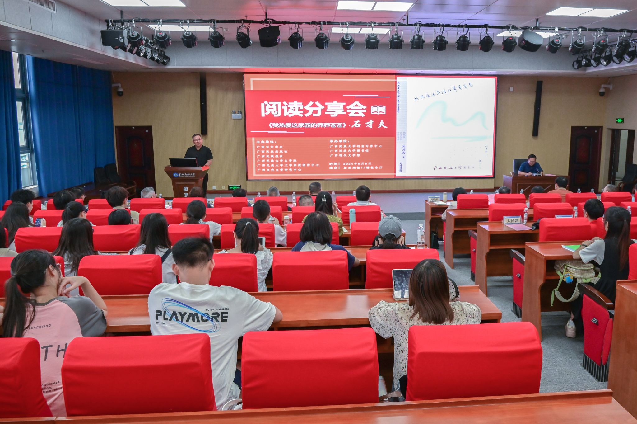 【大學(xué)生通訊社報(bào)道】6月6日下午,《我熱愛(ài)這家園的莽莽蒼蒼》閱讀分享會(huì)在廣西民族大學(xué)相思湖校區(qū)圖書(shū)館13樓會(huì)議室舉行。廣西寫(xiě)作學(xué)會(huì)會(huì)長(zhǎng)、廣西民族大學(xué)副校長(zhǎng)黃曉娟,廣西文學(xué)藝術(shù)界聯(lián)合會(huì)副主席石才夫,廣西寫(xiě)作學(xué)會(huì)名譽(yù)會(huì)長(zhǎng)容本鎮(zhèn)出席本次分享會(huì)。
