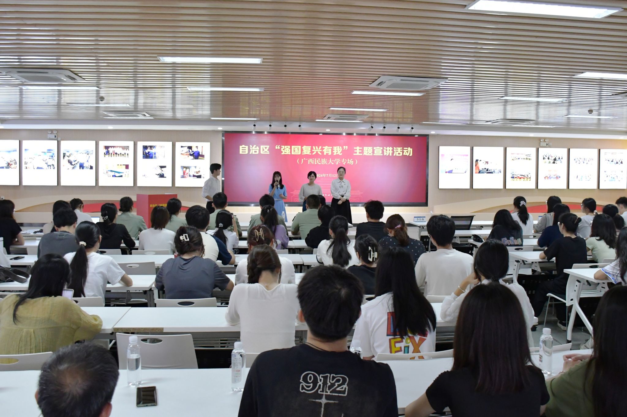 【大學(xué)生通訊社報(bào)道】7月12日,2024年自治區(qū)“強(qiáng)國(guó)復(fù)興有我”主題宣講活動(dòng)廣西民族大學(xué)專場(chǎng)在學(xué)校新時(shí)代“我與祖國(guó)共成長(zhǎng)”黨團(tuán)主題活動(dòng)文明實(shí)踐所舉行。第28屆中國(guó)青年五四獎(jiǎng)?wù)芦@得者李春燕,自治區(qū)“00后話百年”宣講團(tuán)成員張欣琪、蒙鑫美作宣講,學(xué)校各級(jí)團(tuán)組織負(fù)責(zé)人及學(xué)生代表參加活動(dòng)。