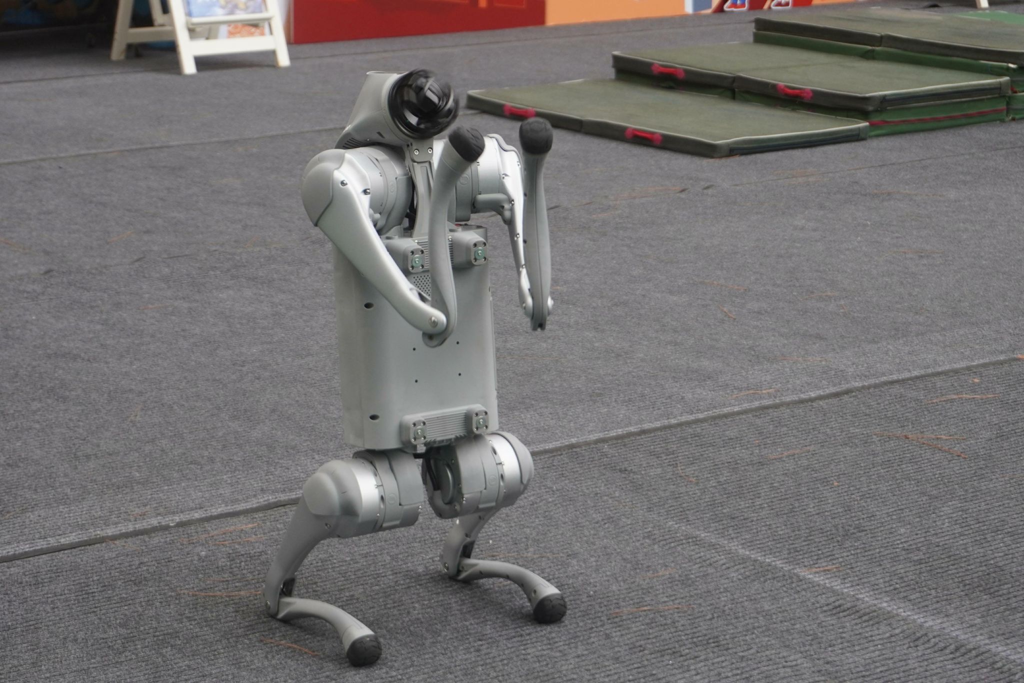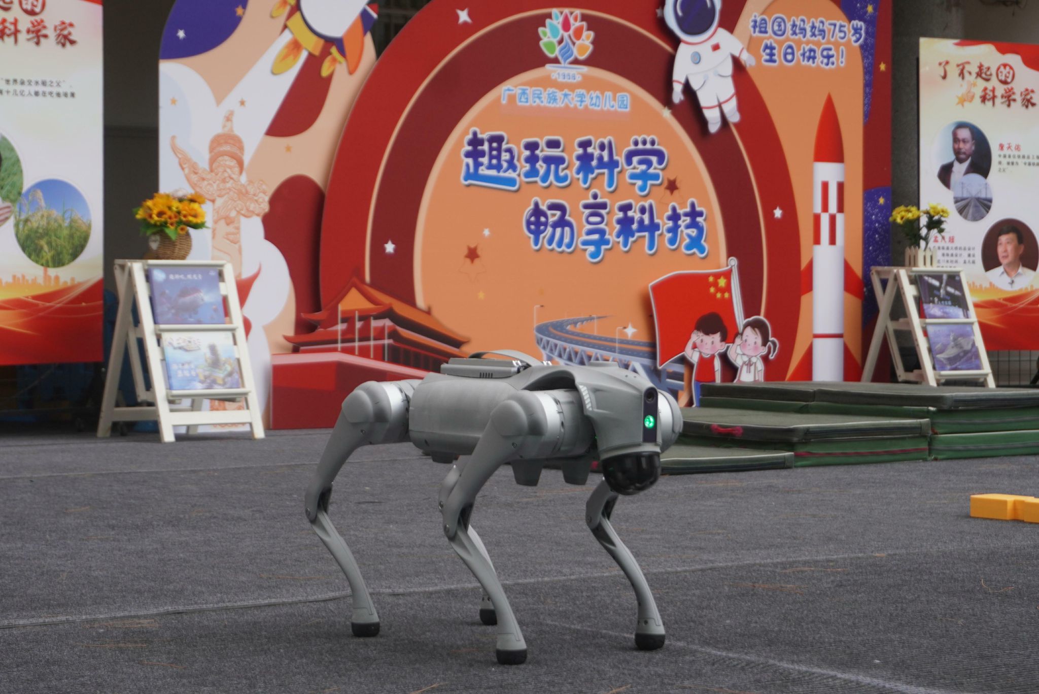 人工智能學院的機器狗“笨笨”和“小黑”早已在舞臺兩側就位,快速進入了表演狀態,它們雙腳站立一起給小朋友們做出“拜年”的姿勢,可愛可掬的模樣引得小朋友們發出連連驚喜、愉悅之聲。隨后“笨笨”帶著輕快、靈敏的步伐跳躍前進,到達“樓梯”,切換至爬行模式,以優雅、從容的姿態上下“樓梯”,最后與“小黑”匯合共同表演舞蹈,這一套動作下來直接收獲了小朋友們的歡心,令他們目不轉睛,掌聲熱烈。