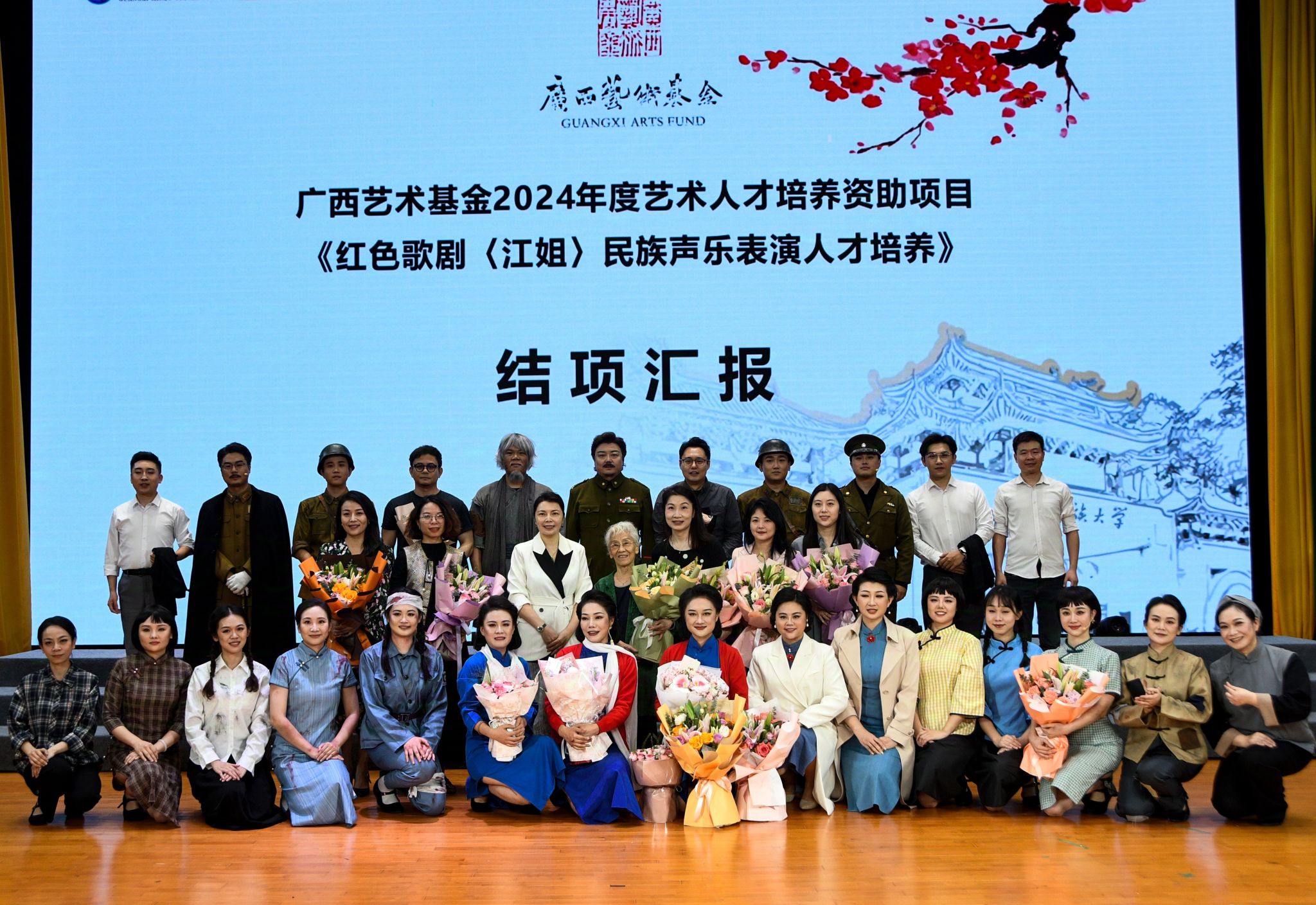 【大學(xué)生通訊社報(bào)道】10月18日晚,廣西藝術(shù)基金2024年度藝術(shù)人才培養(yǎng)資助項(xiàng)目《紅色歌劇〈江姐〉民族聲樂(lè)表演人才培養(yǎng)》結(jié)項(xiàng)匯報(bào)演出在廣西民族大學(xué)舉行。南寧市人大常委會(huì)副主任范衛(wèi)東,學(xué)校黨委常委、副校長(zhǎng)何立榮到場(chǎng)觀看。區(qū)內(nèi)各兄弟院校,廣西文聯(lián)、廣西衛(wèi)視嘉賓,項(xiàng)目組成員及全體學(xué)員,廣西民族大學(xué)各學(xué)院師生代表共賞演出。
