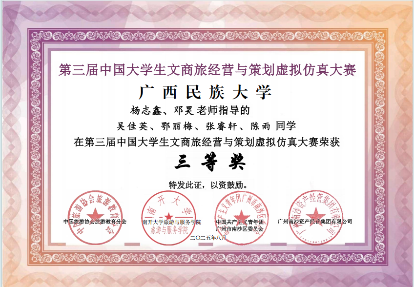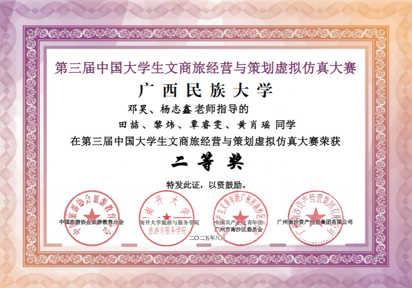 近日,第三屆中國大學生文商旅經營與策劃虛擬仿真大賽全國總決賽在廣州南沙舉行。廣西民族大學管理學院學子組成的兩支隊伍表現優異,斬獲全國二等獎1項(排名全國第21)、三等獎1項、實踐特等獎1項。在同期舉辦的“青春圖南 南沙好young”南沙全域游旅游轉場大賽中,兩支隊伍再獲2項優勝獎,鄧昊和楊志鑫兩位教師獲評“優秀指導教師”。