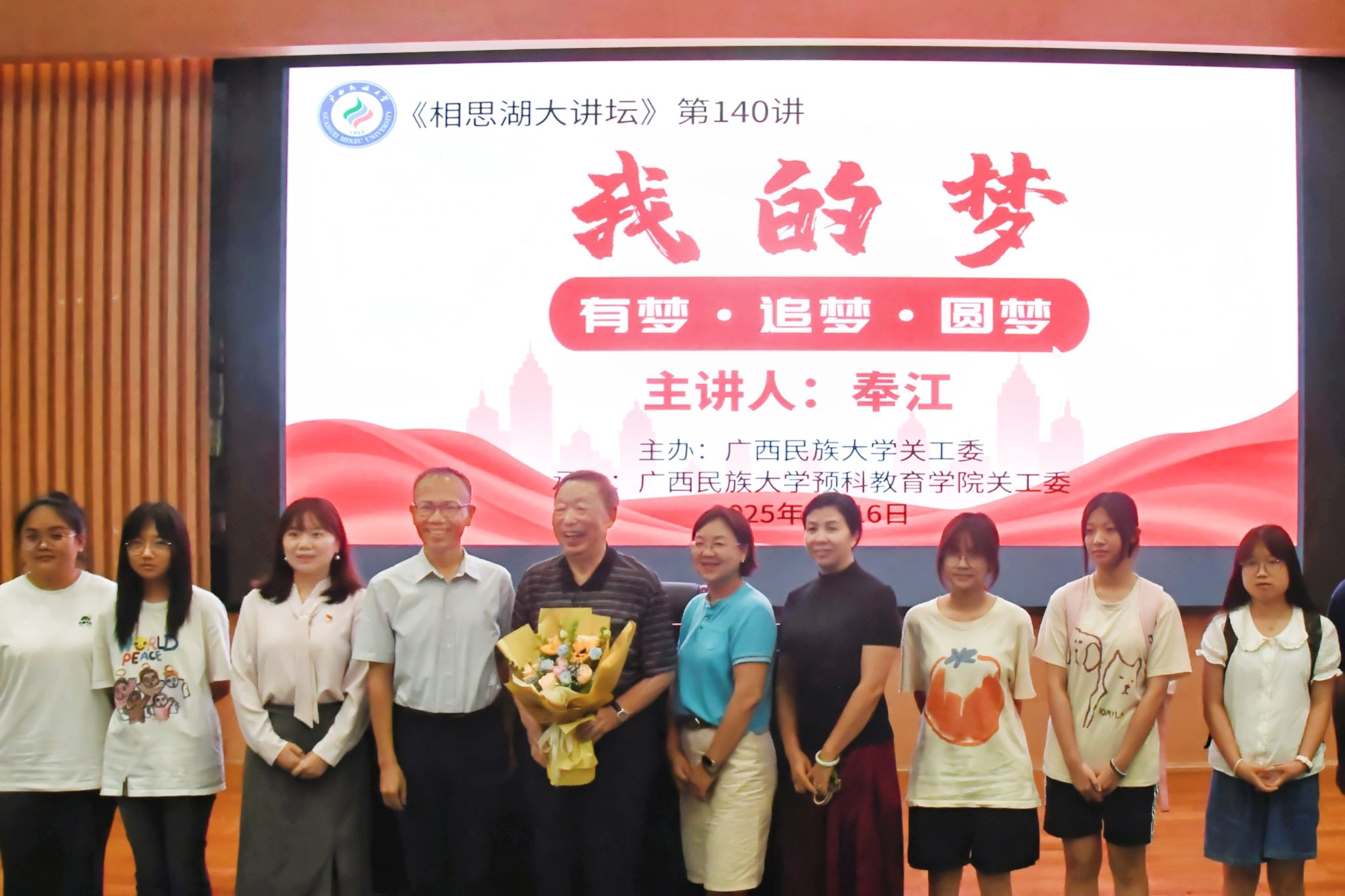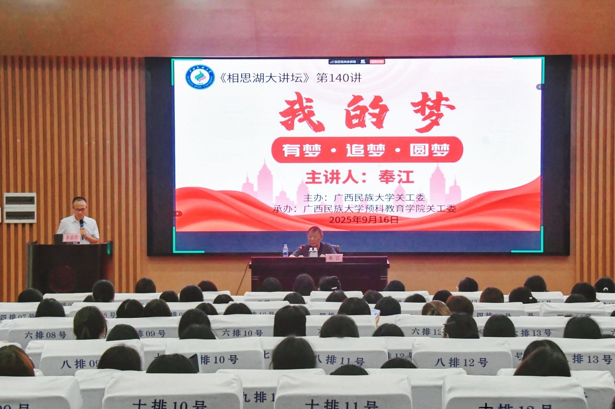 【大學生通訊社報道】9月16日下午,“相思湖大講壇”第140期——“我的夢——有夢·追夢·圓夢”主題講座在廣西民族大學武鳴校區橢圓形報告廳舉行,本次講座由學校原黨委書記、關心下一代工作委員會常務副主任奉江主講。學校關心下一代工作委員會、預科教育學院有關領導和師生參加講座。
